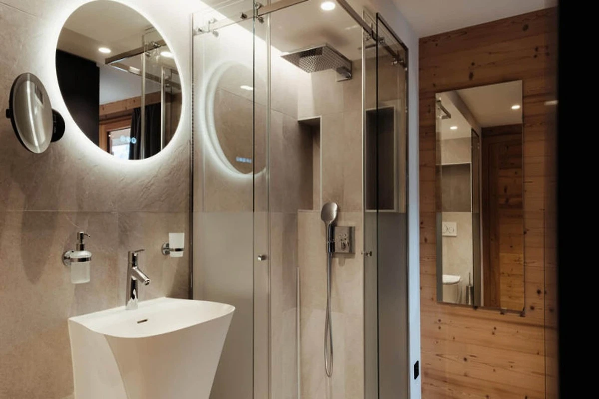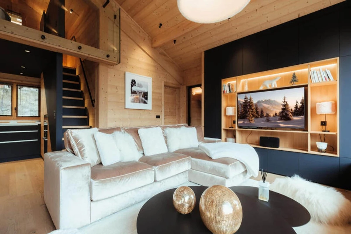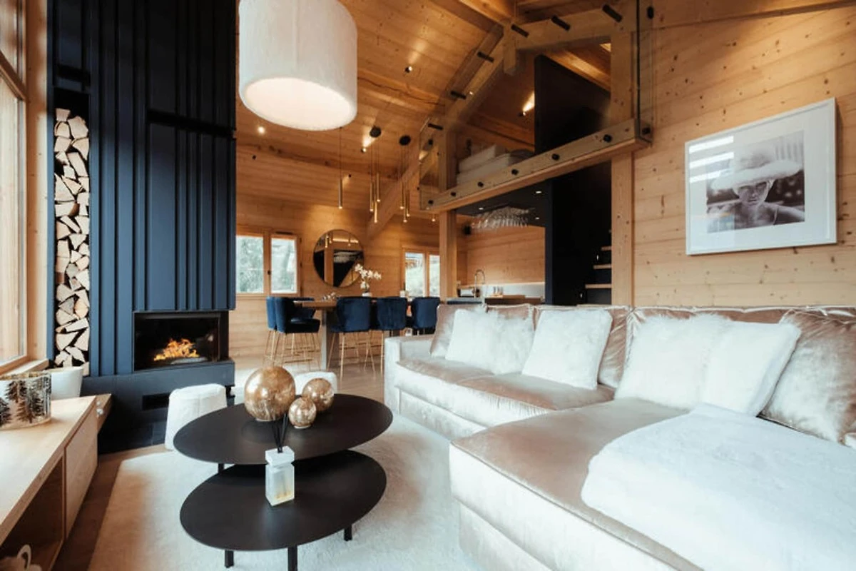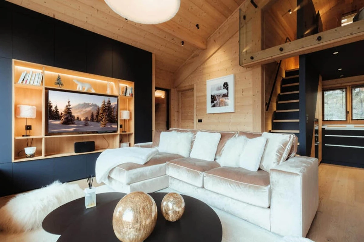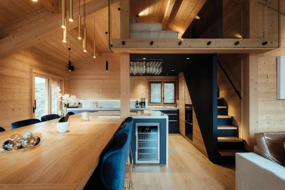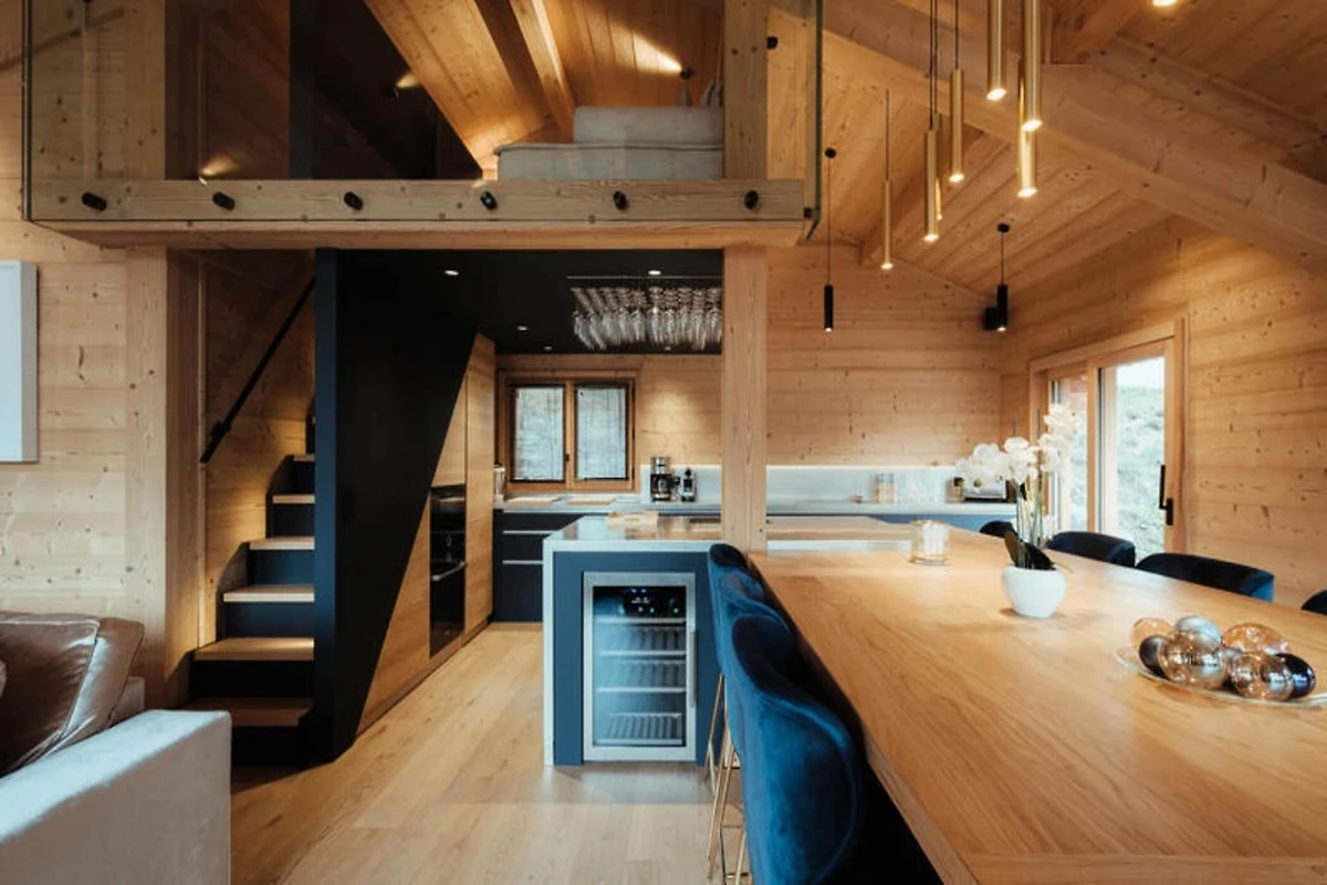 Die voll ausgestattete Küche ist zum Wohnzimmer hin offen und verfügt über hochwertige Geräte wie ein Induktionskochfeld, zwei Geschirrspüler, einen Weinkeller und eine Nespresso-Kaffeemaschine. Es verfügt außerdem über einen Kühlschrank mit Gefrierfach (267 l), einen Backofen und eine Mikrowelle. Die Anordnung der Küche ermöglicht eine einfache Interaktion mit Gästen im Wohnbereich, der mit einem Flachbild-TV und Panoramablick auf die Berge ausgestattet ist. Zu den weiteren Annehmlichkeiten gehören ein Skiraum mit Schuhtrockner für bis zu 10 Paar Schuhe, Fußbodenheizung und ein entspannender Zwischengeschossbereich mit einem Flachbild-TV für zusätzlichen Komfort.