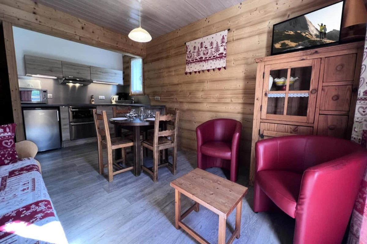 Das Anwesen bietet neben seinem gemütlichen und funktionalen Design eine 33 m² große Wohnung, die Platz für 2 bis 4 Personen bietet. Das Wohnzimmer verfügt über eine Sitzbank mit zwei ausziehbaren Betten, Sesseln und einem Fernseher. Eine Fenstertür öffnet sich auf einen Ostbalkon mit Gartenmöbeln und Sonnenschirm. Das Schlafzimmer verfügt über ein 140 cm breites Doppelbett, ein Babybett und einen Kleiderschrank sowie eine Fenstertür, die auf einen Westbalkon führt. Zu den weiteren Dienstleistungen gehören der Wäscheverleih, die Endreinigung und eine Ermäßigung auf Sommeraktivitäten im Resort. Kleine Haustiere sind gegen eine zusätzliche Gebühr erlaubt und es steht ein Skiraum zur Verfügung. WLAN und reservierte Parkplätze sind im Preis inbegriffen. Heizung, Wasser und Strom sind im Preis inbegriffen.