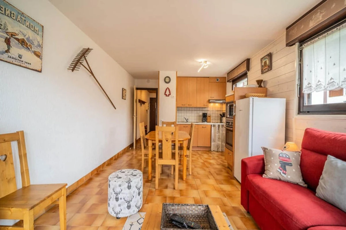 Das Apartment bietet Platz für bis zu 4 Gäste und verfügt über eine Kabine mit zwei Etagenbetten (oberes Etagenbett nur für Kinder über 6 Jahre) und ein helles Wohnzimmer mit einem Rapido-Schlafsofa für 2 Personen, einem Fernseher und einem französischen Fenster, das zur Terrasse führt. Die offene Küche ist komplett ausgestattet mit einer Senseo-Kaffeemaschine, Cerankochfeldern, Backofen, Mikrowelle, Kühlschrank, Gefrierschrank und Geschirrspüler. Das Badezimmer verfügt über eine Badewanne, ein Waschbecken und ein WC. Zu den weiteren Annehmlichkeiten gehören Zentralheizung, Skiraum, Parkplatz und die Möglichkeit, Bettwäsche und Haushaltswäsche zu mieten. WLAN kann gemietet werden (begrenzter Bestand). Die Residenz liegt 34 ??km vom SNCF-Bahnhof und 800 m vom Busbahnhof entfernt