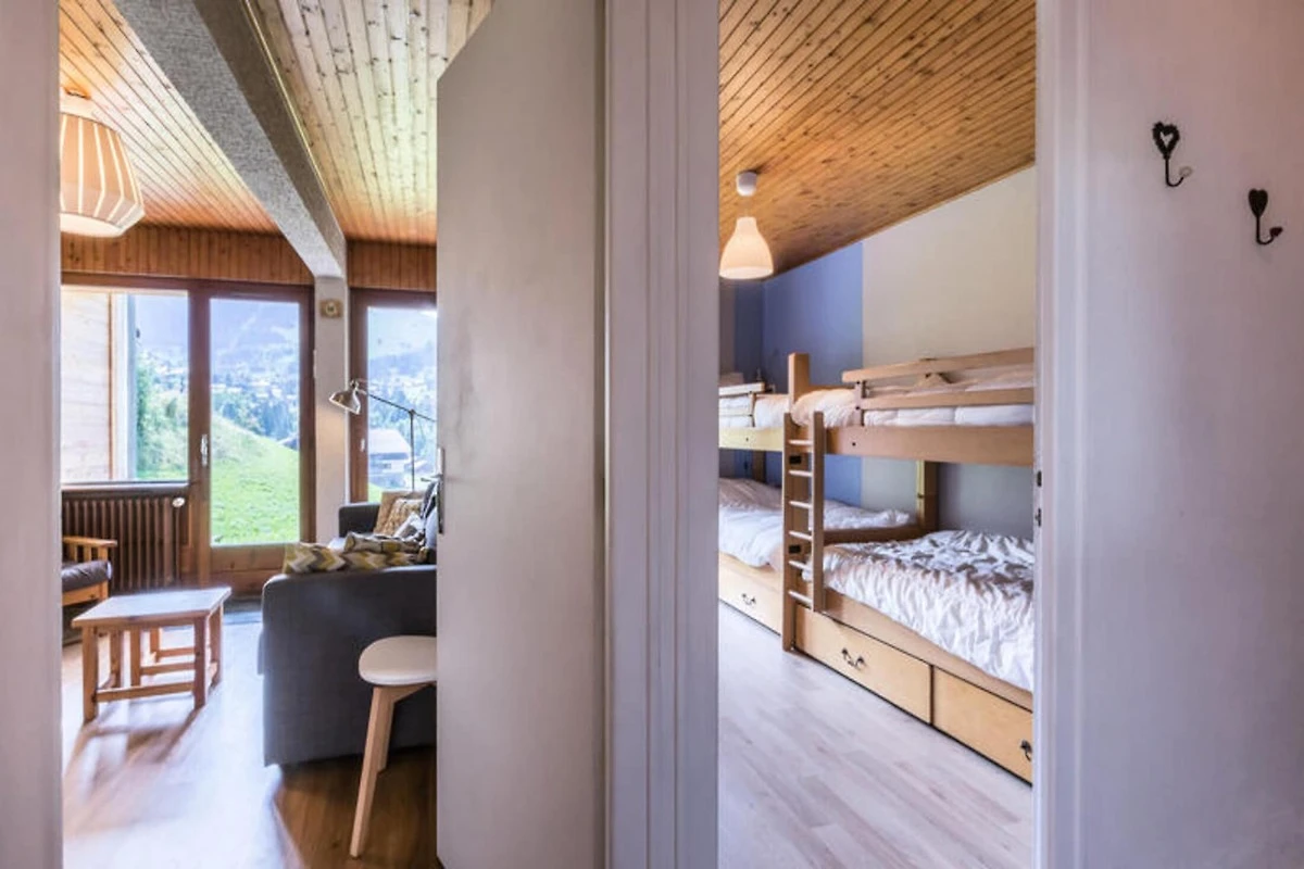 Das Anwesen bietet zusammen mit seiner einladenden und gut gestalteten Aufteilung einen komfortablen Raum für bis zu sechs Gäste. Das 46,40 m² große Apartment verfügt über zwei Schlafzimmer, darunter ein Zimmer mit Etagenbett (nur für Kinder ab 6 Jahren) und ein kleines Schlafzimmer mit Doppelbett. Das Wohnzimmer, das sich zu einer Südterrasse öffnet, bietet ein Sofa und einen Fernseher zum Entspannen. Haustiere sind gegen Aufpreis erlaubt und Gäste können auch Haushaltswäsche, Bettlaken und eine WLAN-Box mieten (je nach Verfügbarkeit). Das Apartment bietet keine kostenlosen Aktivitäten an, aber die nahegelegene Shuttle-Haltestelle ermöglicht einen einfachen Zugang zu den Pisten. Die Wohnung liegt verkehrsgünstig auf Gartenebene mit Bergblick.