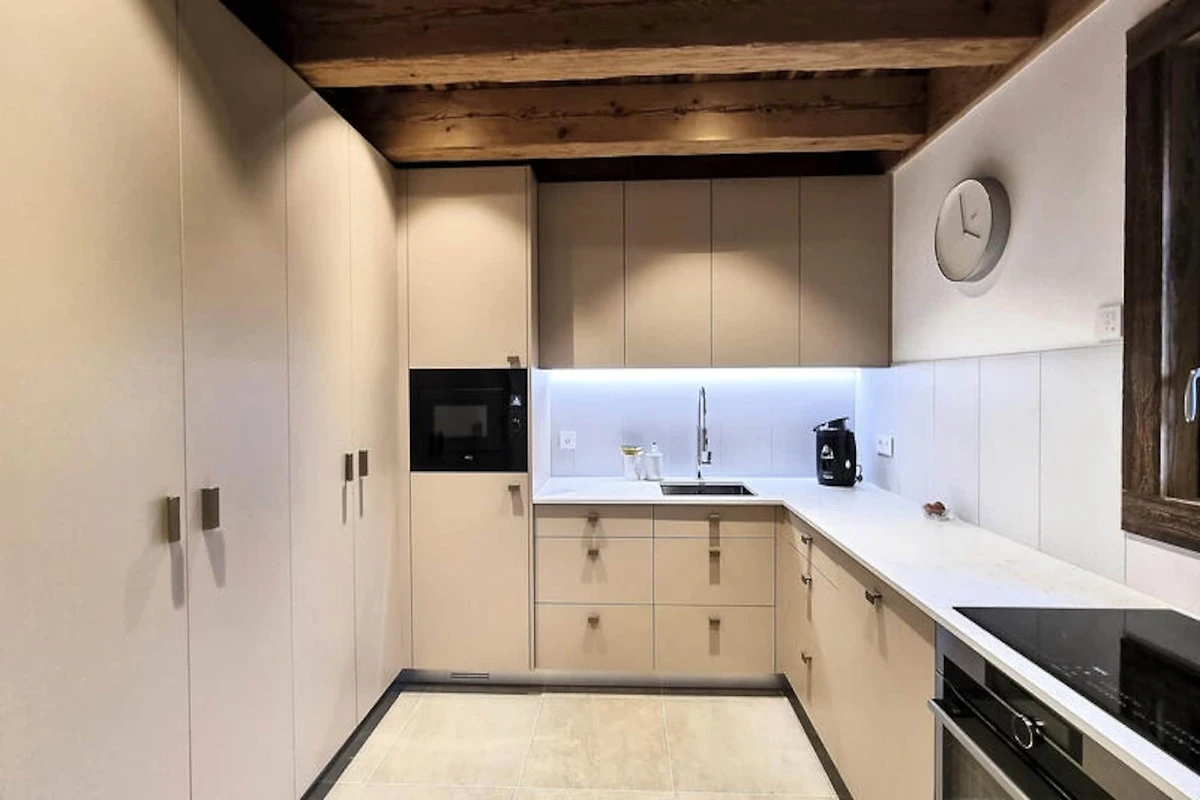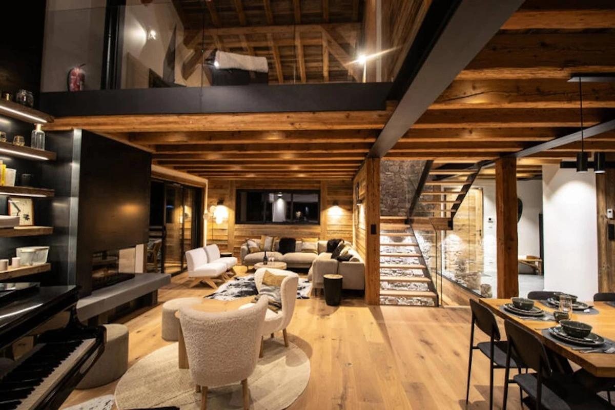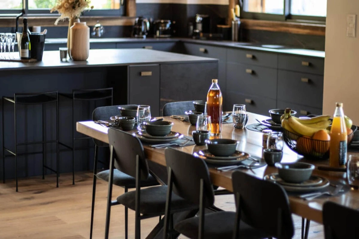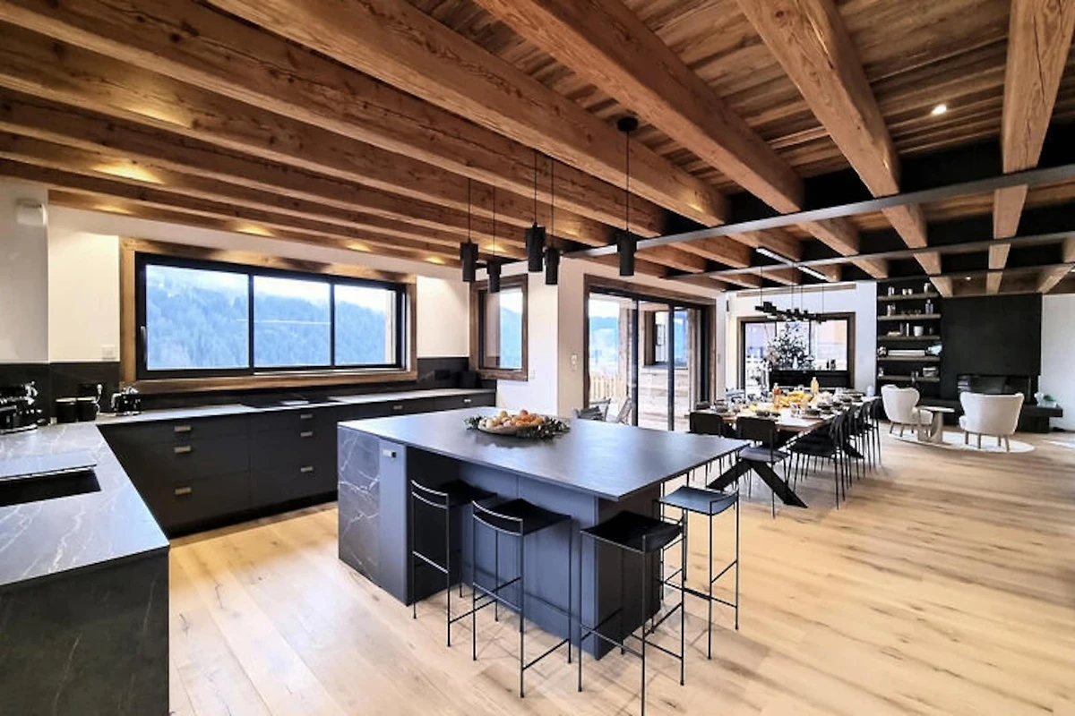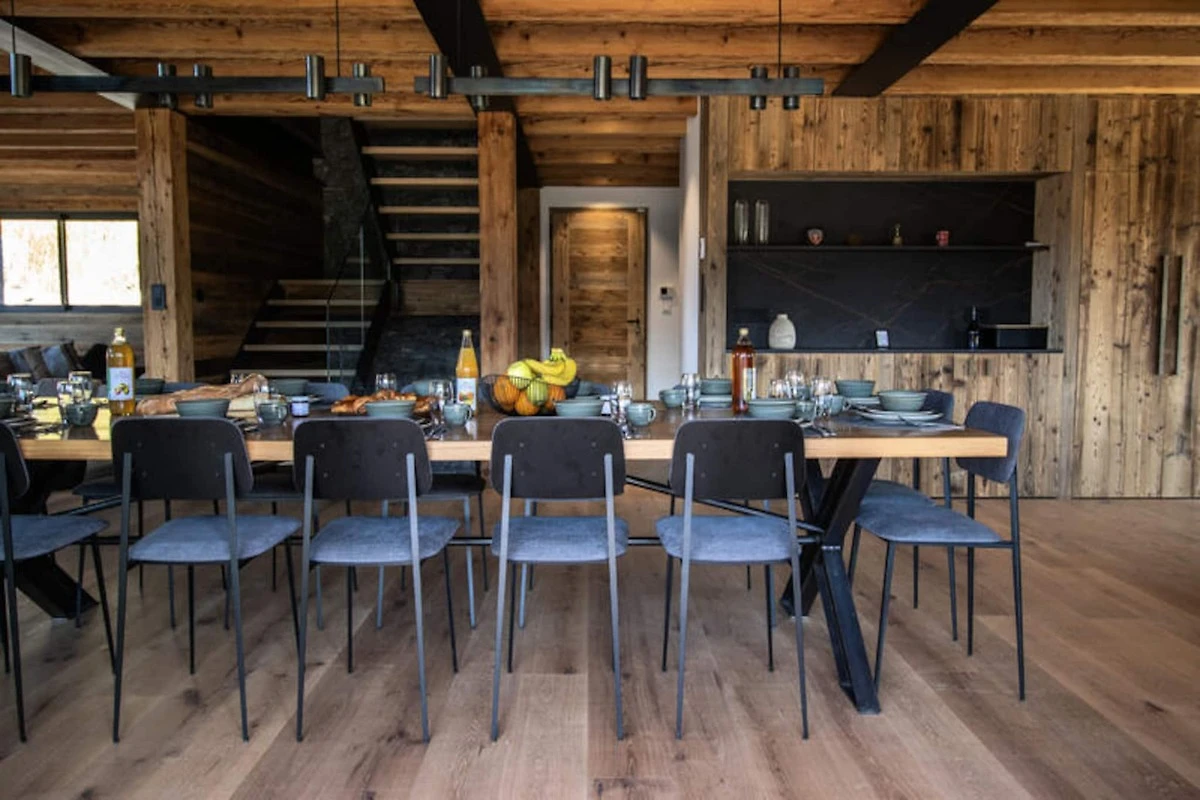 Das Chalet verfügt über eine voll ausgestattete Küche, die für große Gruppen konzipiert ist und alles bietet, was Sie zum Zubereiten von Mahlzeiten benötigen. Den Gästen stehen moderne Geräte wie ein Backofen, ein Herd, ein Kühlschrank und ein Geschirrspüler zur Verfügung. Der geräumige Essbereich neben dem Wohnzimmer bietet ausreichend Sitzgelegenheiten für große Zusammenkünfte, während der Loungebereich einen gemütlichen Raum zum Entspannen bietet. Zu den weiteren Annehmlichkeiten gehören ein Skiraum zur Aufbewahrung der Ausrüstung und zwei Garagenstellplätze mit Lademöglichkeiten für Elektrofahrzeuge. Mit seiner Kombination aus modernen Annehmlichkeiten und traditionellem Alpencharme ist dieses Chalet ein idealer Rückzugsort für alle, die sowohl Entspannung als auch Abenteuer in den französischen Alpen suchen.