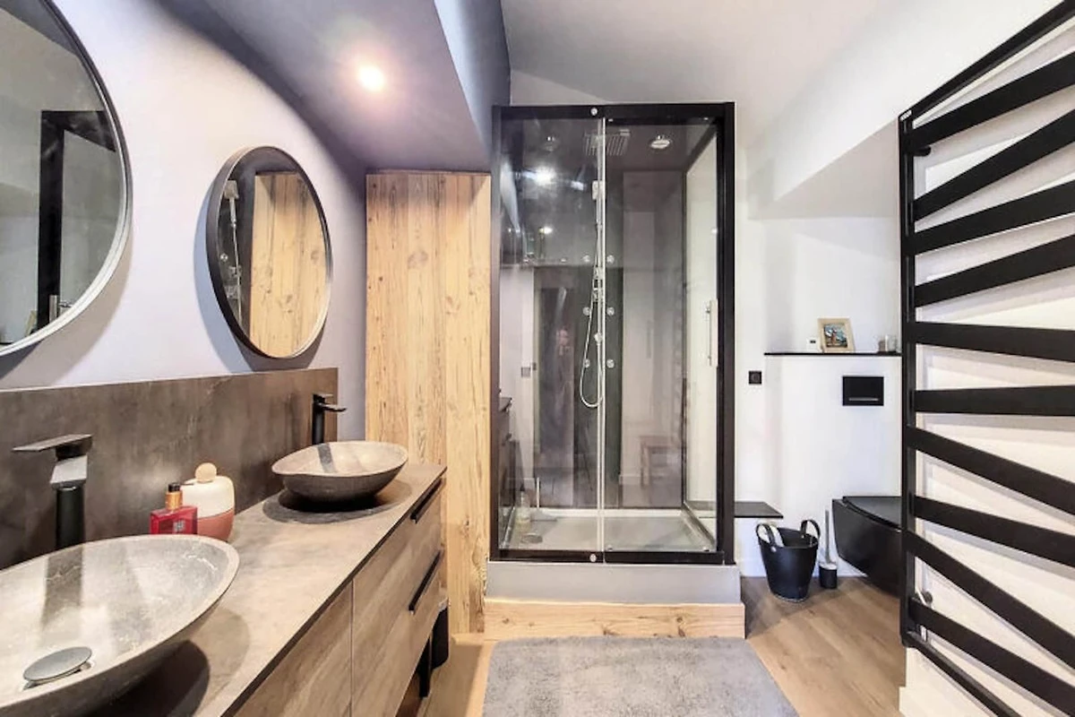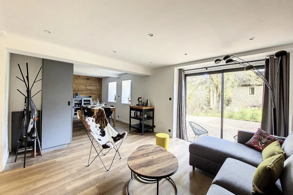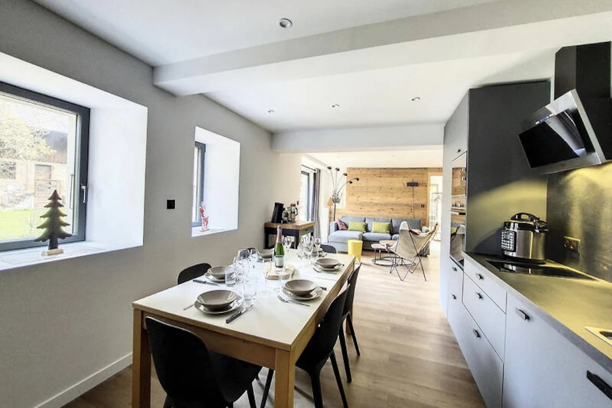 Beide Etagen des Chalets verfügen über voll ausgestattete Küchen mit modernen Annehmlichkeiten wie Induktionskochfeldern, Geschirrspülern, Öfen und Kühlschränken. Die Wohnzimmer sind hell und geräumig und verfügen jeweils über bequeme Sitzgelegenheiten und einen Fernseher. Zu den weiteren Annehmlichkeiten gehören ein Essbereich, mehrere Duschräume mit Handtuchtrocknern und ein separates WC auf jeder Etage. Gäste können die Außenterrasse mit Grill für Sommermahlzeiten nutzen und in den wärmeren Monaten einen Fahrradkeller nutzen.