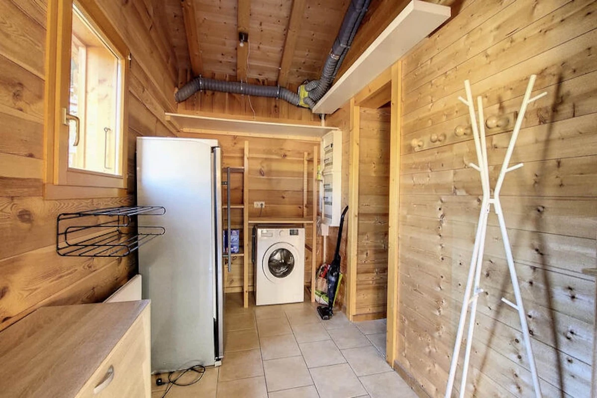 Das Chalet verfügt über eine voll ausgestattete Küche mit modernen Geräten, darunter Geschirrspüler, Gasherd, Backofen, Kaffeemaschine und Mikrowelle, die die Zubereitung von Mahlzeiten einfach und angenehm machen. Für zusätzlichen Komfort verfügt das Chalet außerdem über zwei Badezimmer mit Duschen und eine separate Toilette. Zu den weiteren Annehmlichkeiten zählen eine Waschmaschine, ein Kühlschrank und ausreichend Stauraum. Im Außenbereich gibt es eine Terrasse mit Gartenmöbeln, einem Grill und einer Tischtennisplatte, auf der Sie die schöne Umgebung genießen können. Die Unterkunft bietet außerdem private Parkplätze, um einen stressfreien Aufenthalt zu gewährleisten.