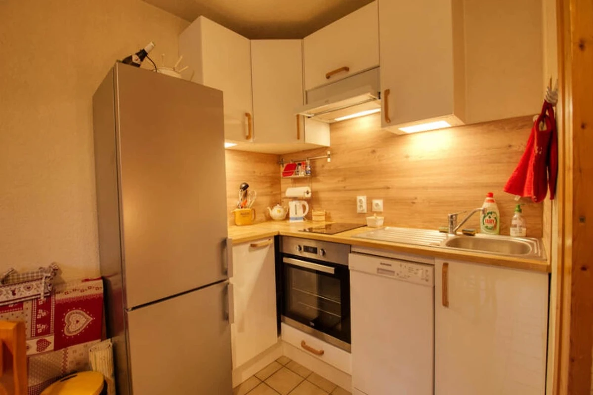 Das Apartment verf�gt �ber eine voll ausgestattete K�che mit K�hl-/Gefrierschrank, Cerankochfeld, Backofen, Geschirrsp�ler, Mikrowelle sowie einer elektrischen Filterkaffeemaschine und einer Nespresso-Pad-Kaffeemaschine. Es verf�gt au�erdem �ber wichtige Gerהte wie einen Toaster, einen Wasserkocher, ein Raclettegerהt und ein Fonduegerהt. F�r den Komfort steht ein Skiraum zur Verf�gung und grundlegende Annehmlichkeiten wie ein Staubsauger sorgen f�r einen komfortablen Aufenthalt.