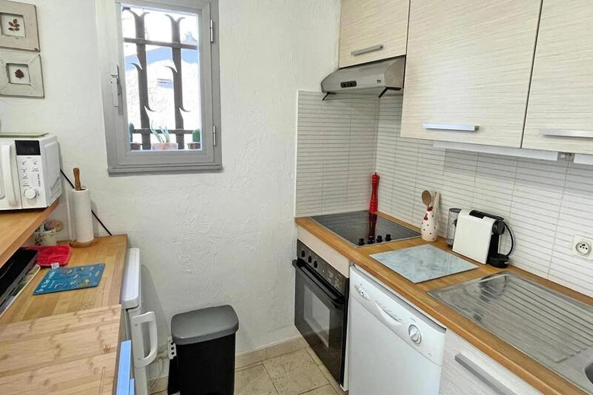 Diese 38 m² große 2-Zimmer-Ferienwohnung im 1. Stock bietet Platz für bis zu 3 Personen. Es verfügt über ein klimatisiertes Wohnzimmer mit einem Sofa, Sesseln, einem Flachbild-TV und einem ausziehbaren 80-cm-Einzelbett. Der Raum öffnet sich zu einer 8 m² großen Terrasse mit Ess- und Ruhemöbeln. Die offene Küche ist komplett ausgestattet mit einem Cerankochfeld, einem Kühlschrank, einem Geschirrspüler, einem Backofen, einer Mikrowelle und dem wichtigsten Kochgeschirr. Das Badezimmer verfügt über einen Waschtisch, eine Badewanne, ein WC und eine Waschmaschine.