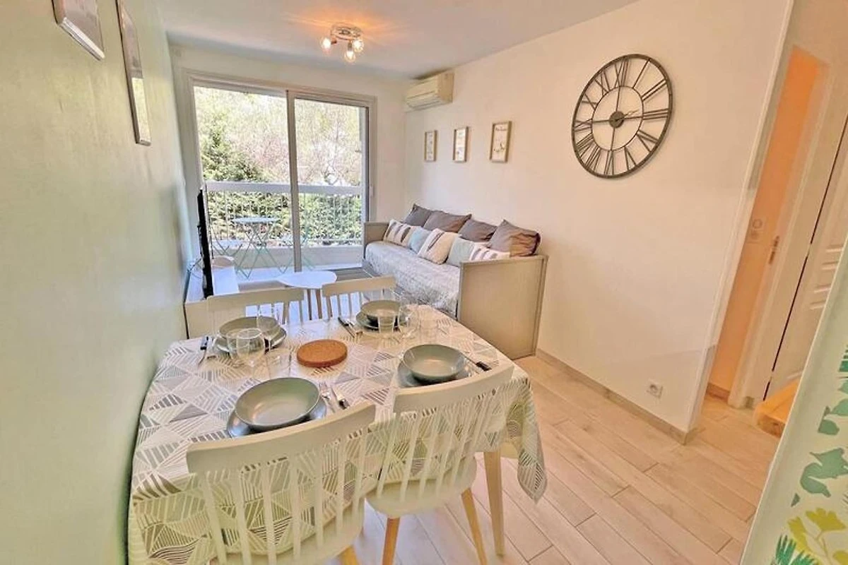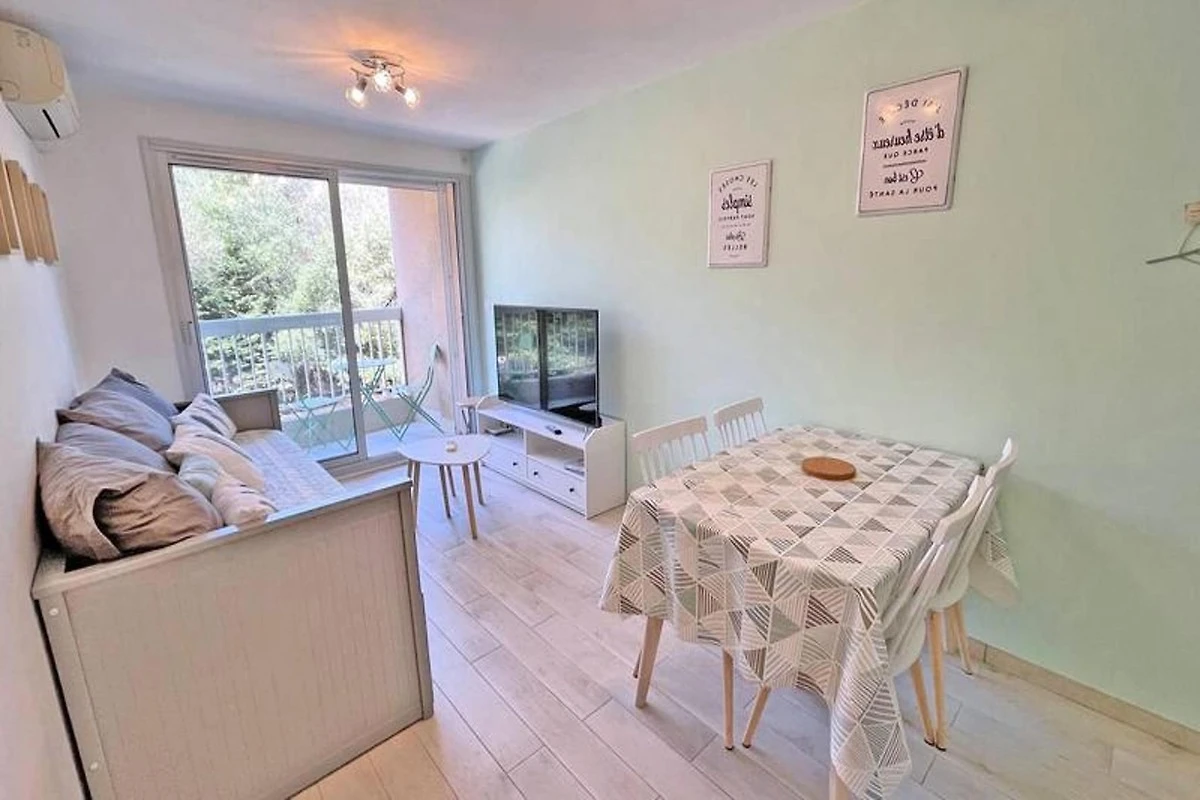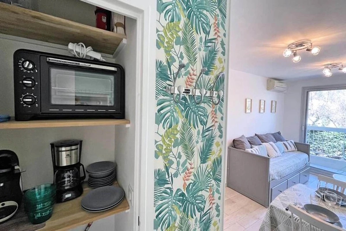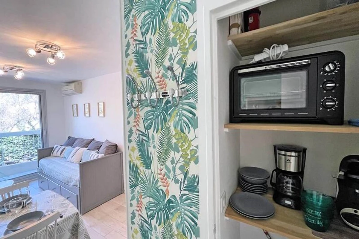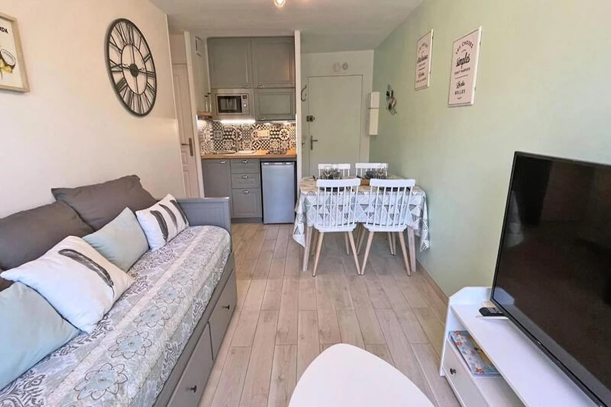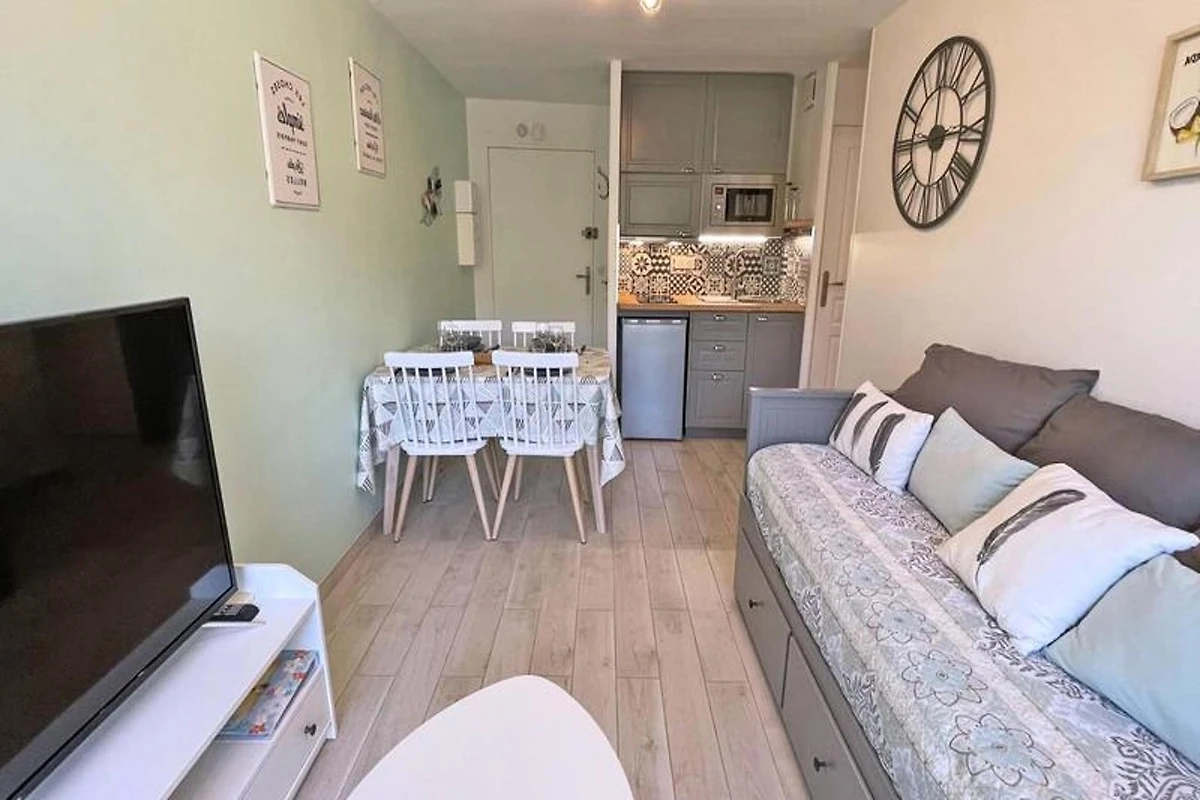 Dieses gemütliche 27m² große Apartment im 1. Stock der Résidence Golfe Bleu ist ideal für bis zu drei Gäste. Es verfügt über ein Wohnzimmer mit einer klimatisierten Sitzecke, einem ausziehbaren Schlafsofa (80 cm), einem TV und einem Esstisch mit Zugang zum Balkon. Die Küchenzeile ist mit einem Mini-Backofen, einer Mikrowelle, einem 2-Flammen-Induktionskochfeld, einer Tassimo-Kaffeemaschine und einem kleinen Kühlschrank mit Gefrierfach ausgestattet. Das Schlafzimmer verfügt über ein 140 cm breites Doppelbett, Stauraum, Klimaanlage und einen Fernseher. Das Apartment verfügt außerdem über ein Badezimmer mit Dusche und Waschmaschine sowie ein separates WC.
