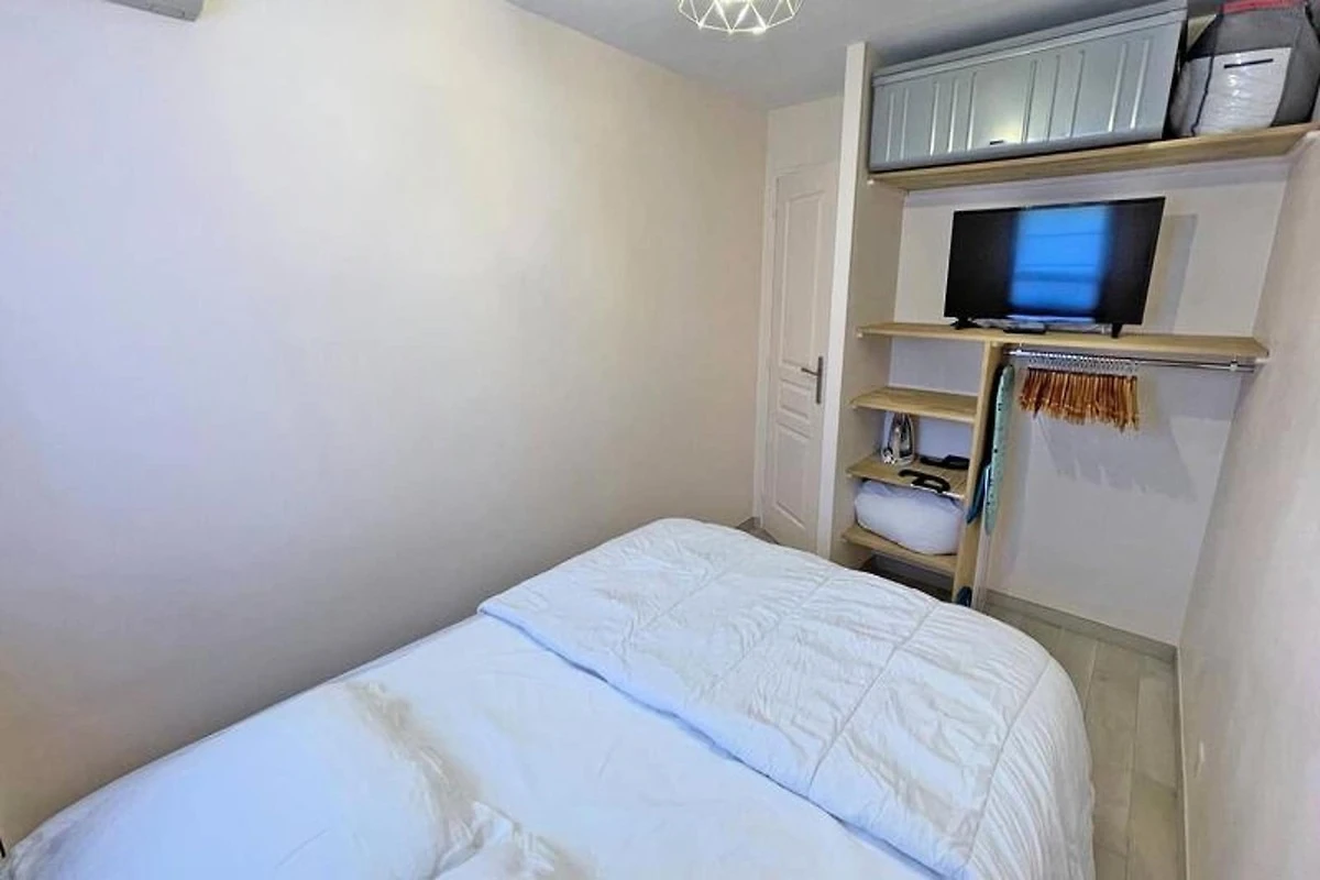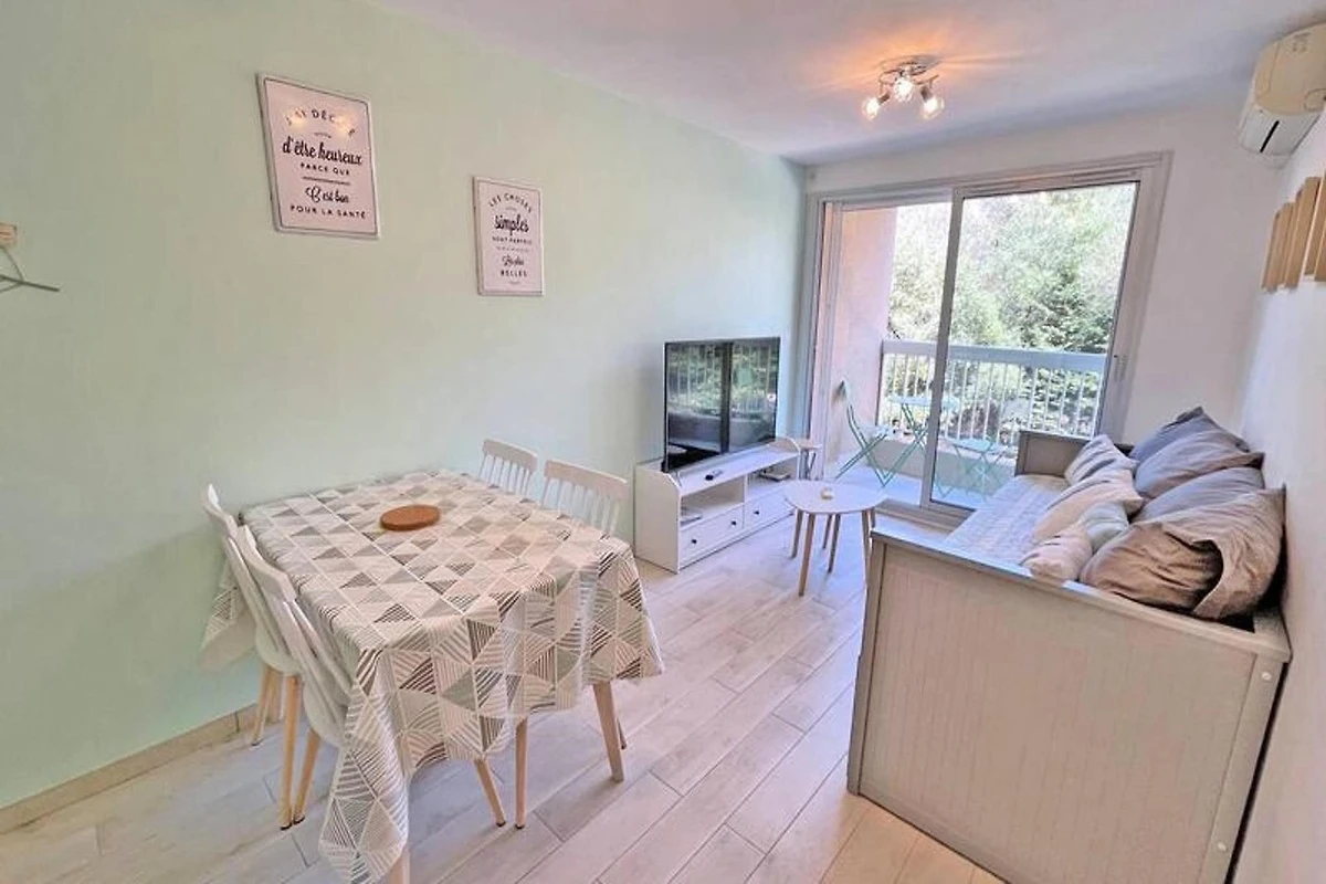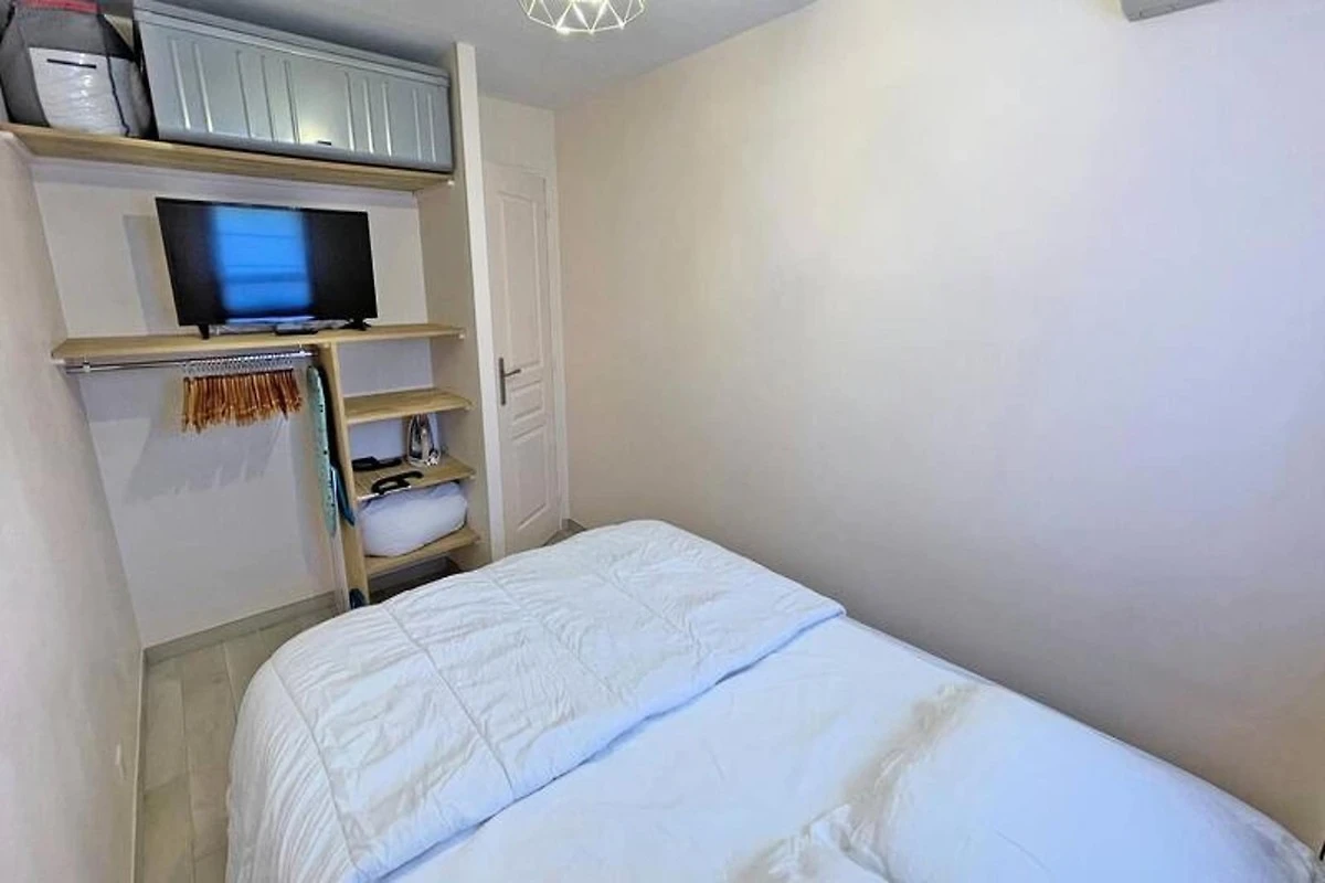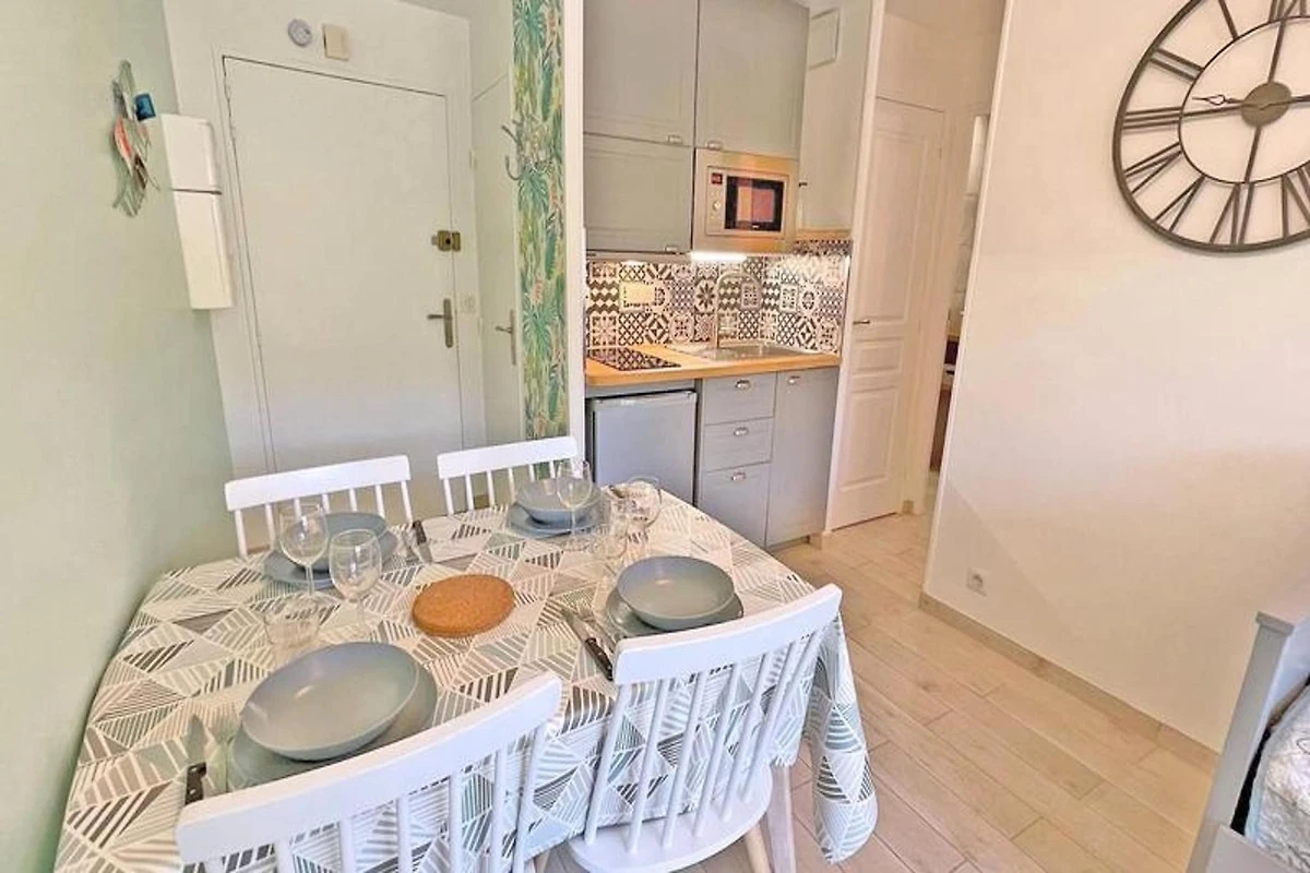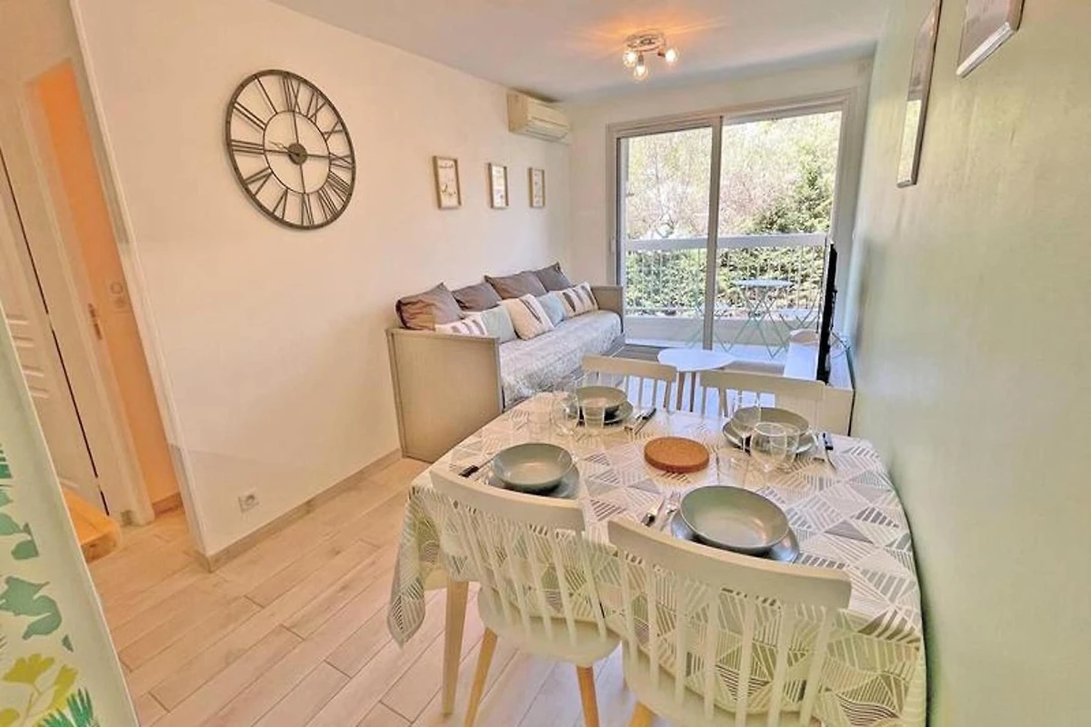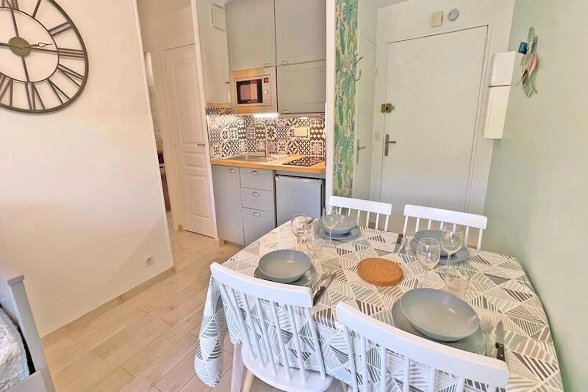 Dieses gemütliche 27m² große Apartment im 1. Stock der Résidence Golfe Bleu ist ideal für bis zu drei Gäste. Es verfügt über ein Wohnzimmer mit einer klimatisierten Sitzecke, einem ausziehbaren Schlafsofa (80 cm), einem TV und einem Esstisch mit Zugang zum Balkon. Die Küchenzeile ist mit einem Mini-Backofen, einer Mikrowelle, einem 2-Flammen-Induktionskochfeld, einer Tassimo-Kaffeemaschine und einem kleinen Kühlschrank mit Gefrierfach ausgestattet. Das Schlafzimmer verfügt über ein 140 cm breites Doppelbett, Stauraum, Klimaanlage und einen Fernseher. Das Apartment verfügt außerdem über ein Badezimmer mit Dusche und Waschmaschine sowie ein separates WC.