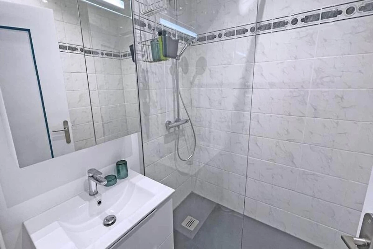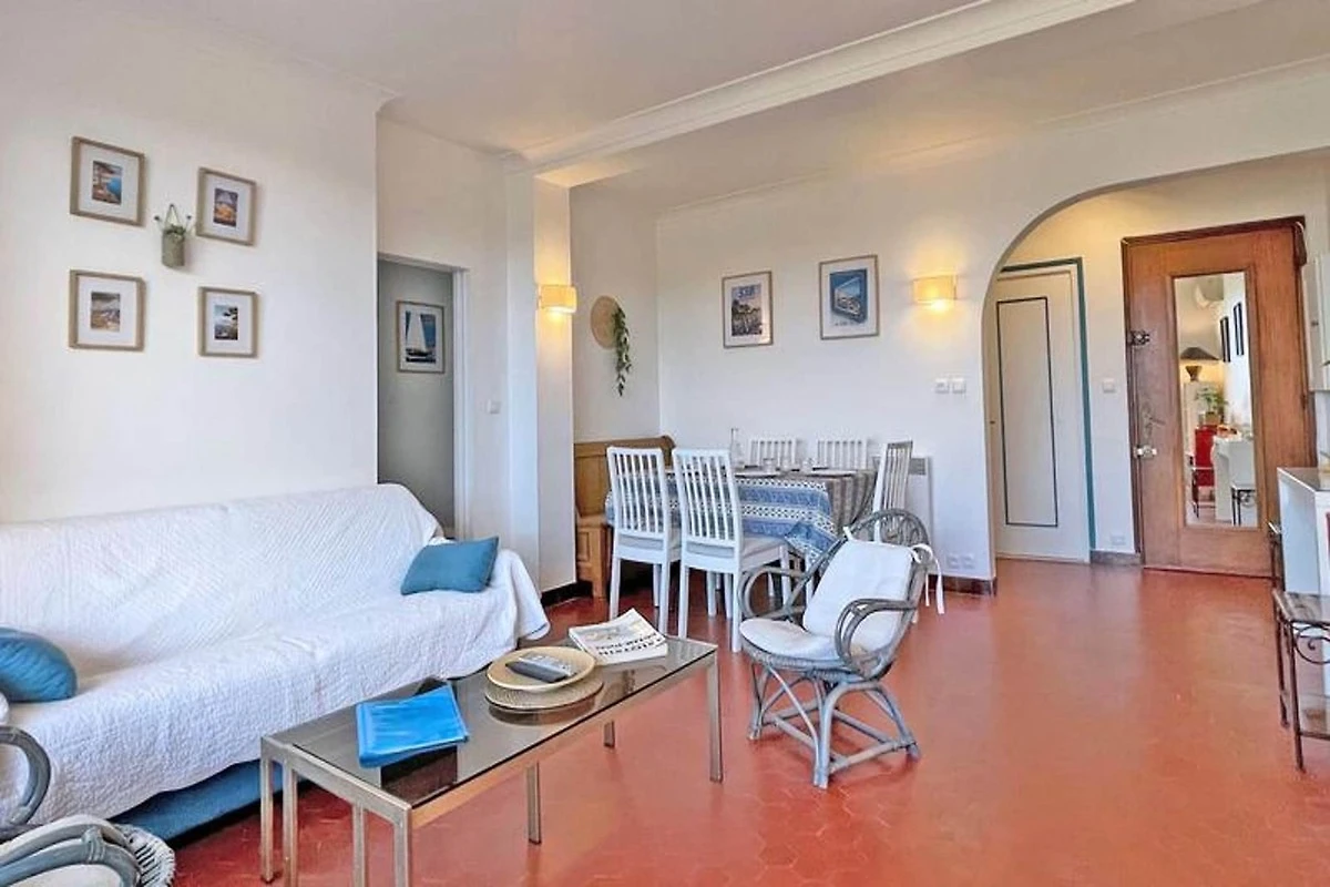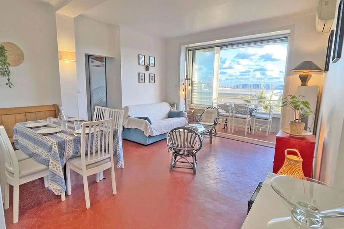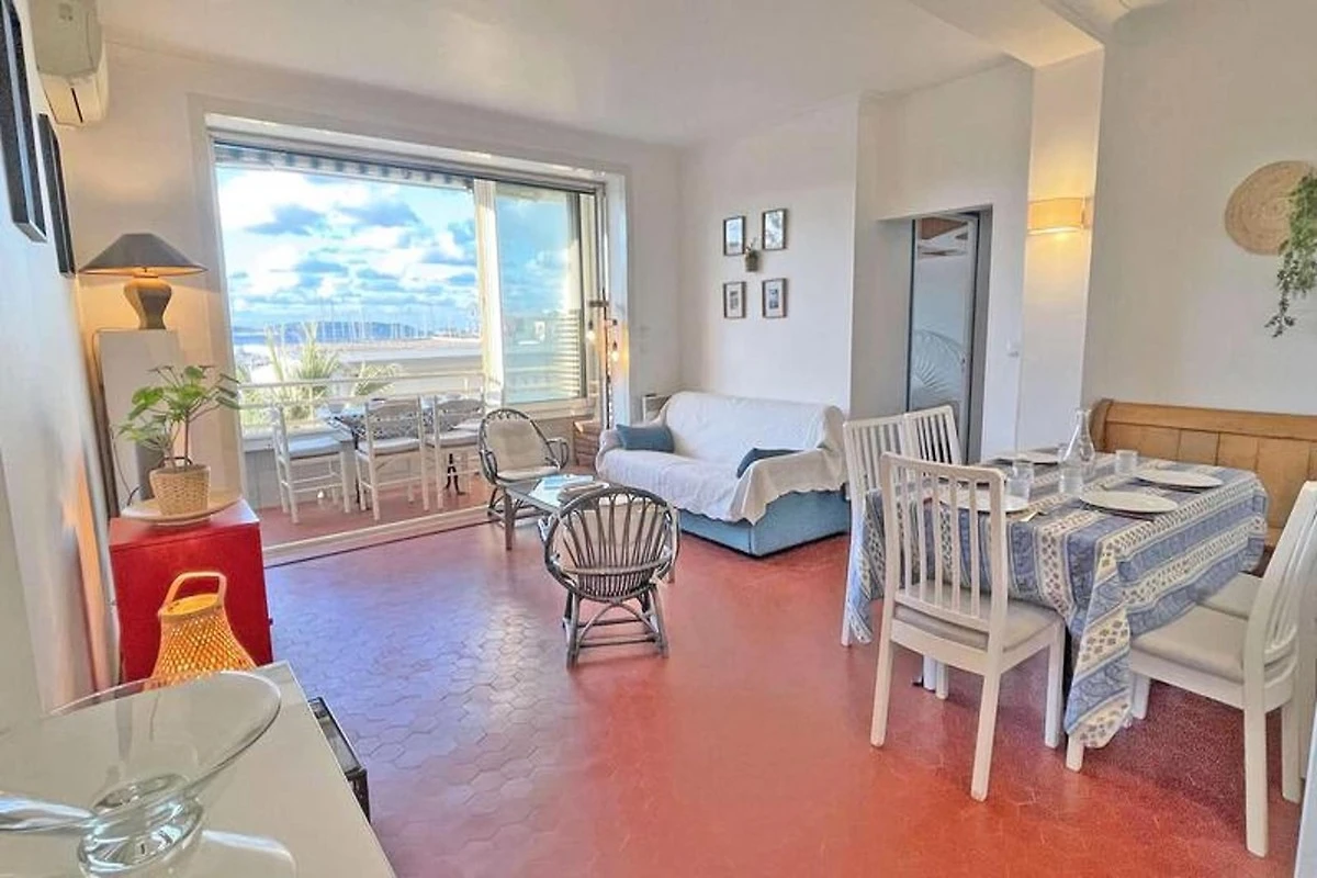 Dieses geräumige, 55 m² große Apartment im 2. Stock der Résidence Les Dauphins bietet einen angenehmen Aufenthalt für bis zu sechs Gäste. Der klimatisierte Wohnbereich verfügt über bequeme Sofas, einen Couchtisch, einen Fernseher und einen Essbereich mit Tisch und Stühlen, der zu einer Loggia mit Meerblick führt. Die voll ausgestattete Küche verfügt über einen Kühlschrank, ein Cerankochfeld, einen Backofen, eine Mikrowelle, einen Geschirrspüler, eine Waschmaschine und einen Trockner sowie die wichtigsten Utensilien. Die Wohnung verfügt über zwei Schlafzimmer: eines mit einem 140 cm breiten Doppelbett und Meerblick und das andere mit einem 140 cm breiten Doppelbett und drei 90 cm breiten Einzelbetten (Etagenbett und ein Ausziehbett). Ein modernes Badezimmer und ein separates WC runden die Ausstattung ab.