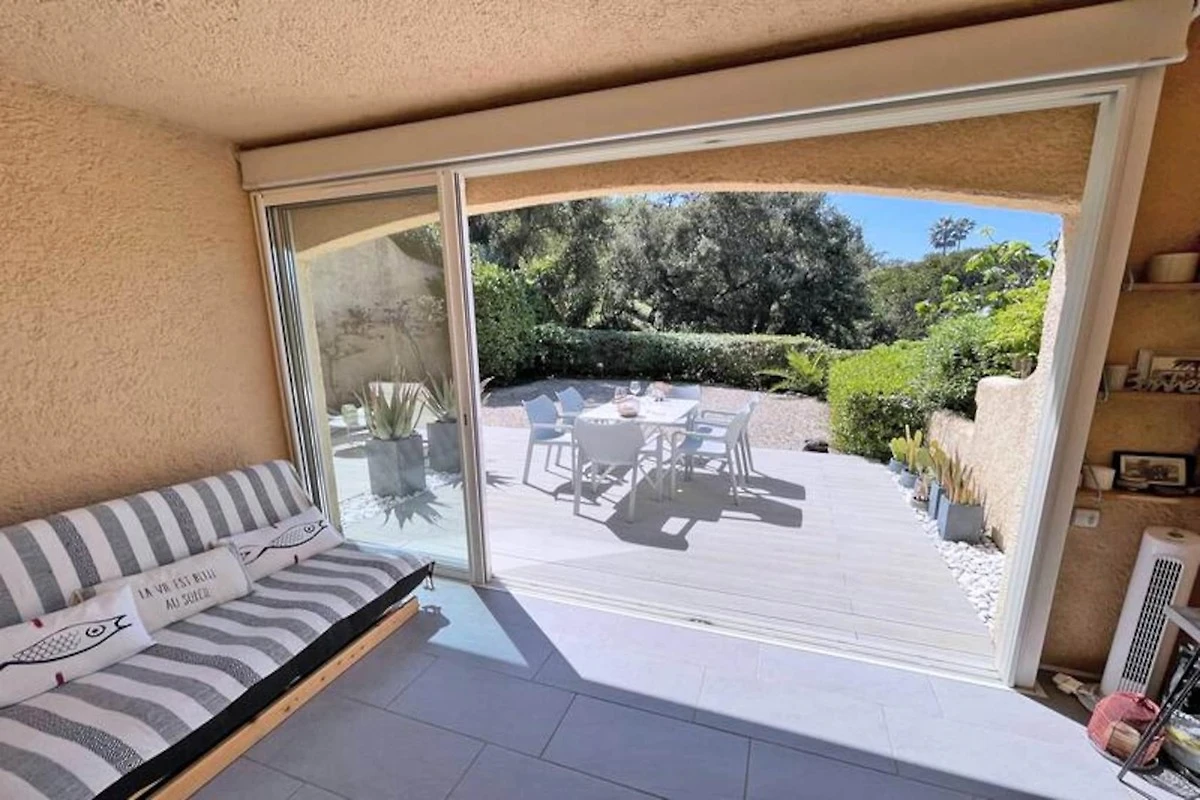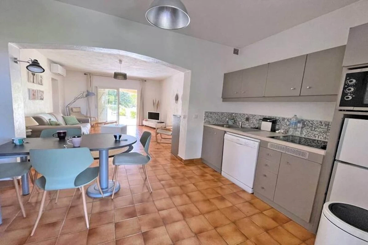 Das Apartment verfügt über eine gut ausgestattete Küche mit modernen Geräten, darunter Kühlschrank, Gefrierschrank, Backofen und Geschirrspüler. Das Badezimmer ist praktischerweise mit einer Dusche und einer Waschmaschine ausgestattet. Genießen Sie die große private Terrasse mit Gartenmöbeln, ideal zum Essen oder Entspannen an der frischen Luft.