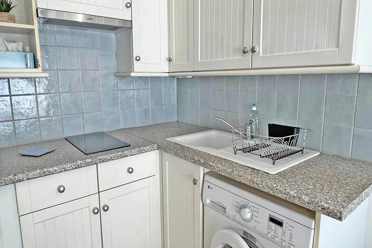 Zu den weiteren Annehmlichkeiten gehört eine mobile Klimaanlage im Wohnzimmer, ideal für wärmere Tage. Dank der erstklassigen Lage der Residenz können Gäste die Gegend bequem erkunden und die lokalen Sehenswürdigkeiten genießen, ohne ein Auto zu benötigen. Es ist der perfekte Ausgangspunkt für einen erholsamen Urlaub und bietet Komfort und Bequemlichkeit.