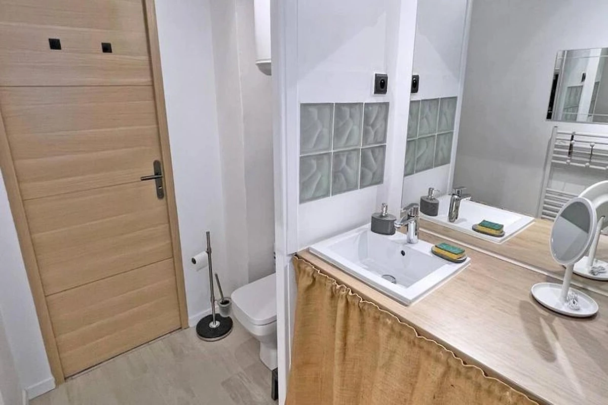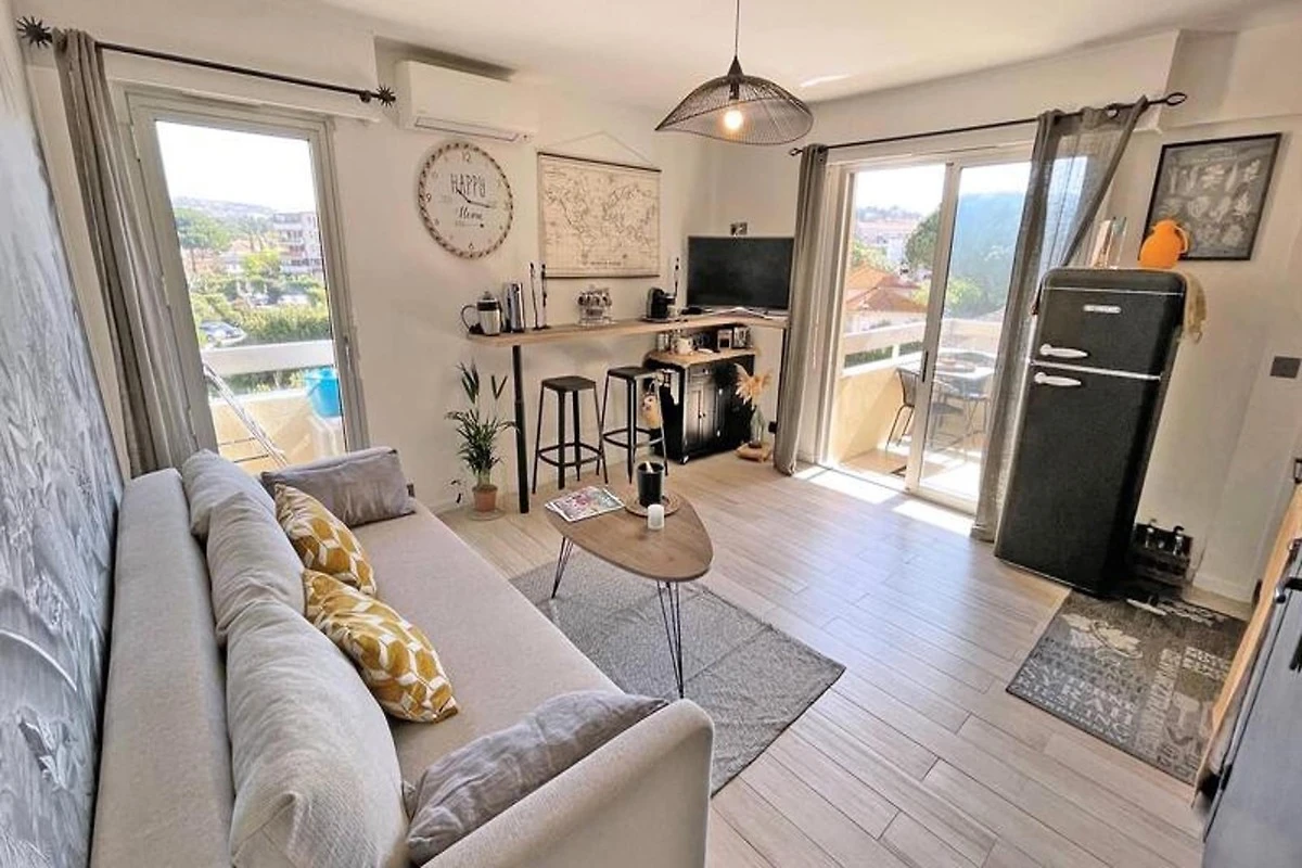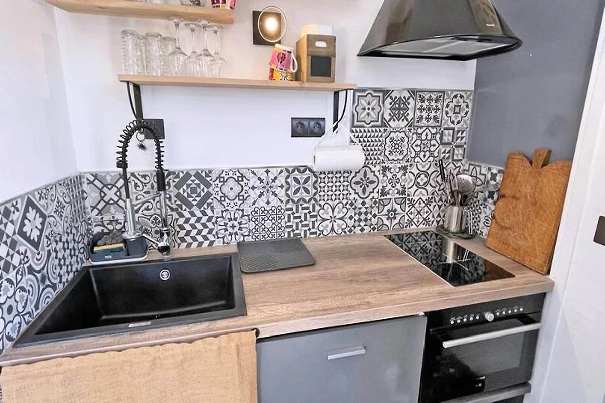 Dieses charmante, 26 m² große Studio befindet sich im 3. Stock und ist mit dem Aufzug erreichbar. Es ist ein komplett renovierter und gemütlicher Rückzugsort, ideal für Paare oder Freunde. Der klimatisierte Hauptraum verfügt über ein 160 cm großes Schlafsofa vom Typ „Rapido“, einen Flachbild-TV und eine Bar mit Hockern. Die offene Küche ist gut ausgestattet mit modernen Geräten, darunter einem 2-Flammen-Induktionskochfeld, einem Backofen, einer Mikrowelle, einer Nespresso-Maschine und verschiedenen Küchenutensilien. Ein Badezimmer mit Dusche, Waschtisch und Waschmaschine rundet den Innenraum ab, während die Terrasse mit Essmöbeln und Sofa einen einladenden Platz zum Entspannen mit freiem Ausblick bietet.