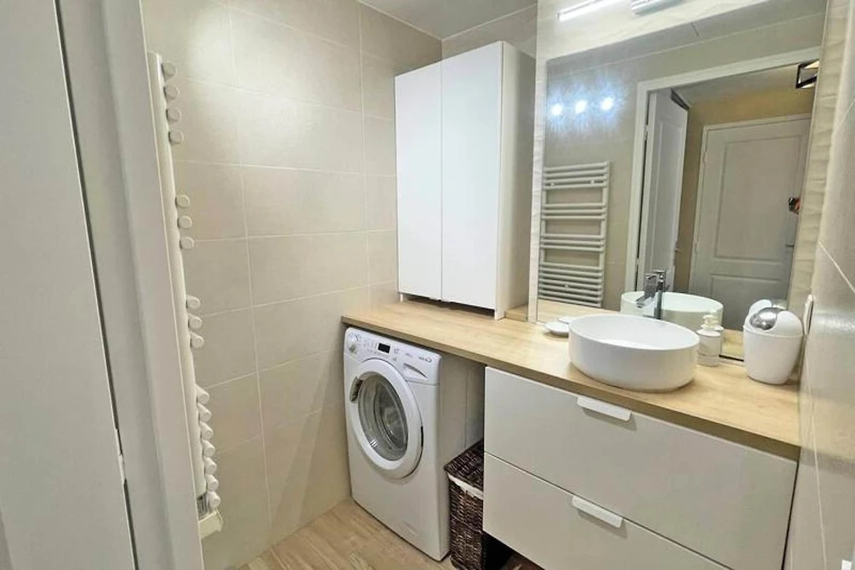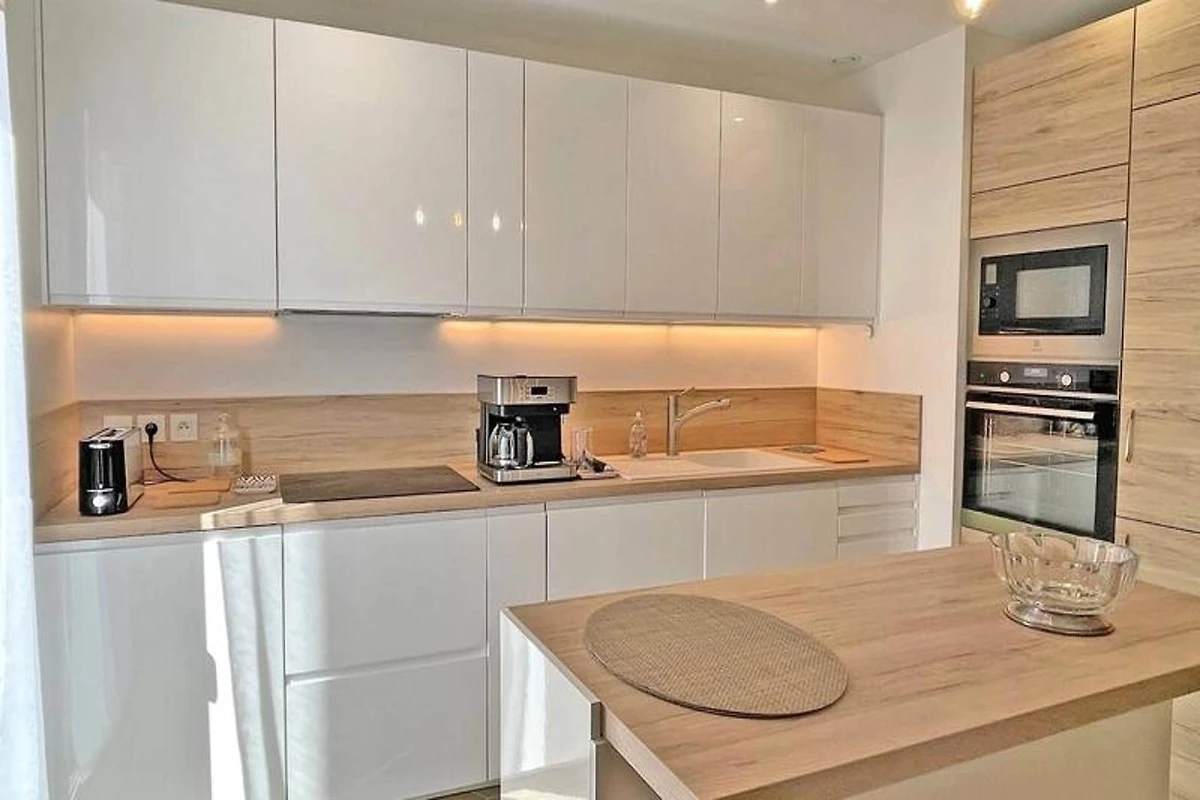 Das Apartment bietet außerdem eine 50 m² große Terrasse mit Essmöbeln und Liegestühlen, ideal zum Entspannen im Freien. Zu den weiteren Annehmlichkeiten gehören eine private Tiefgarage für ein Fahrzeug, Glasfaser-WLAN und eine zentrale Klimaanlage im gesamten Gebäude. Haustiere sind auf Anfrage willkommen und dank des Highspeed-Internets ist Telearbeit möglich.
