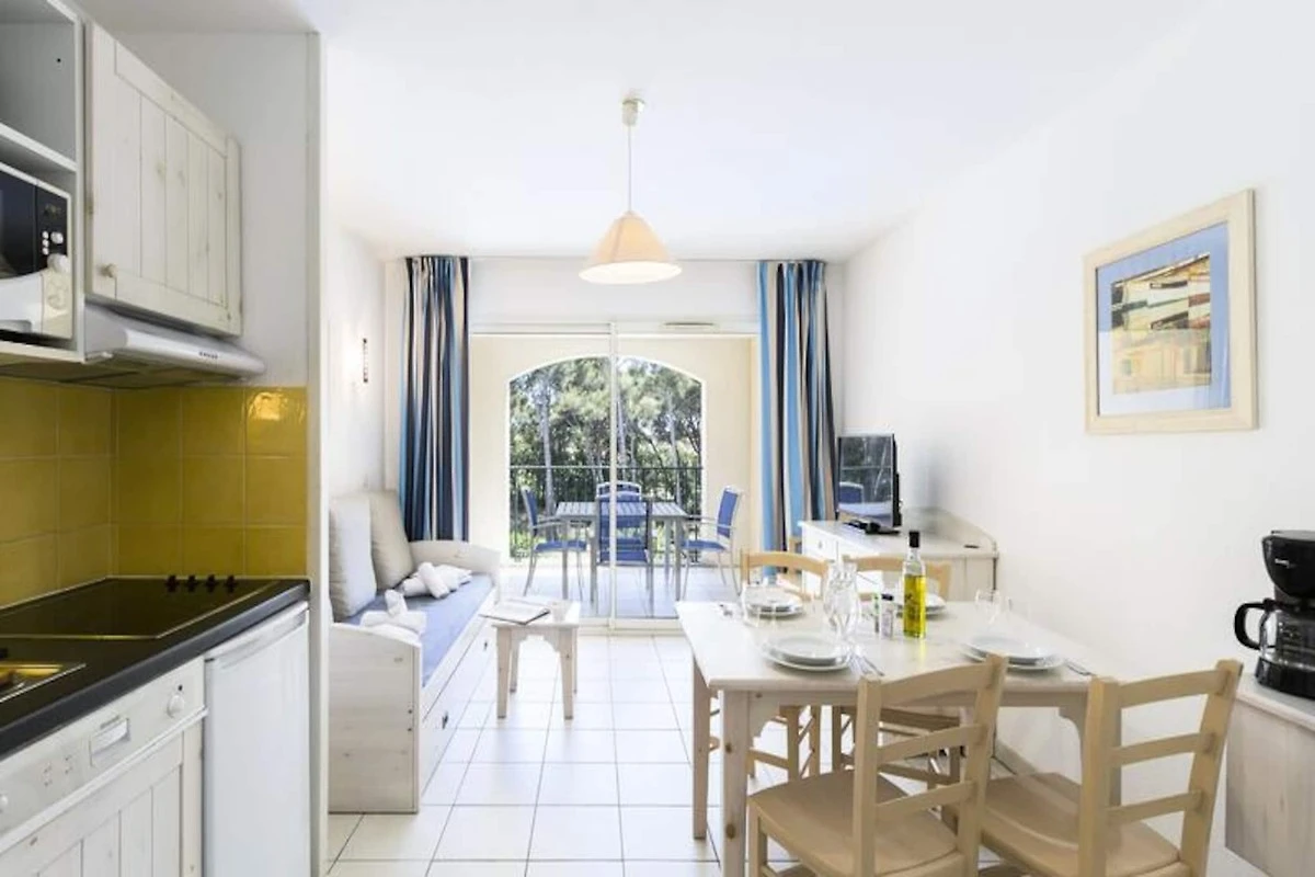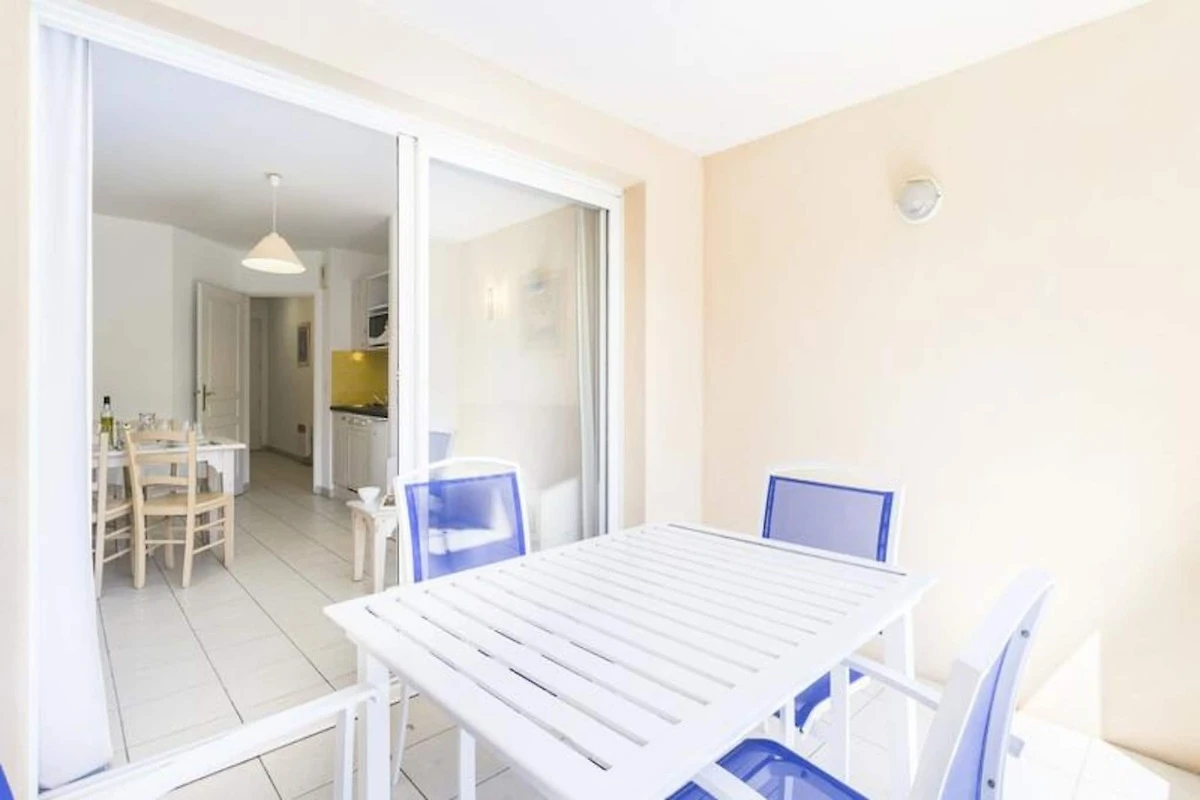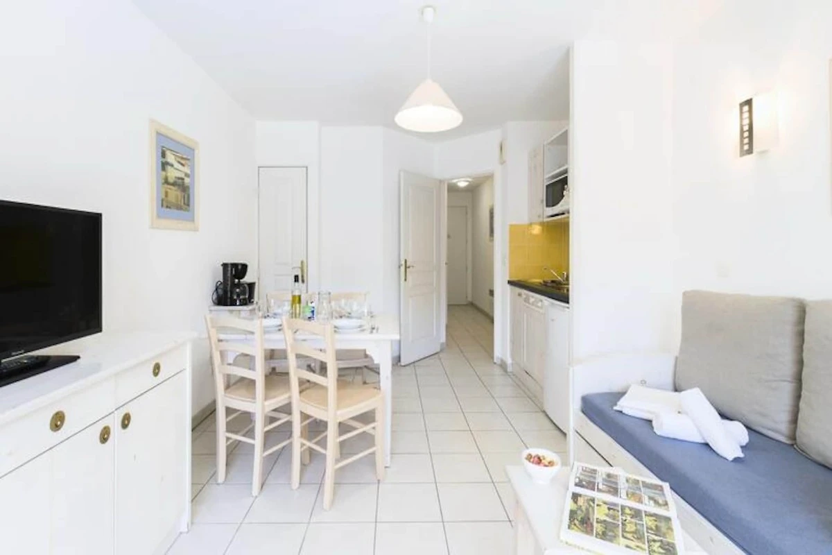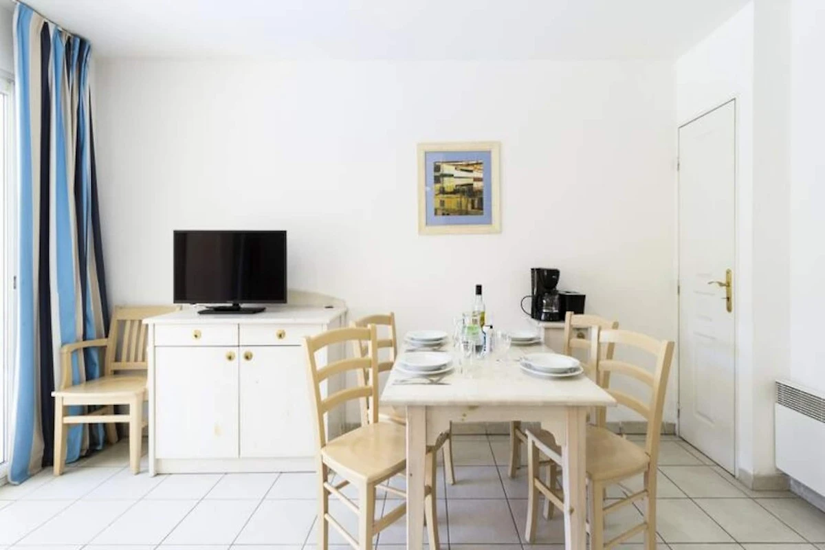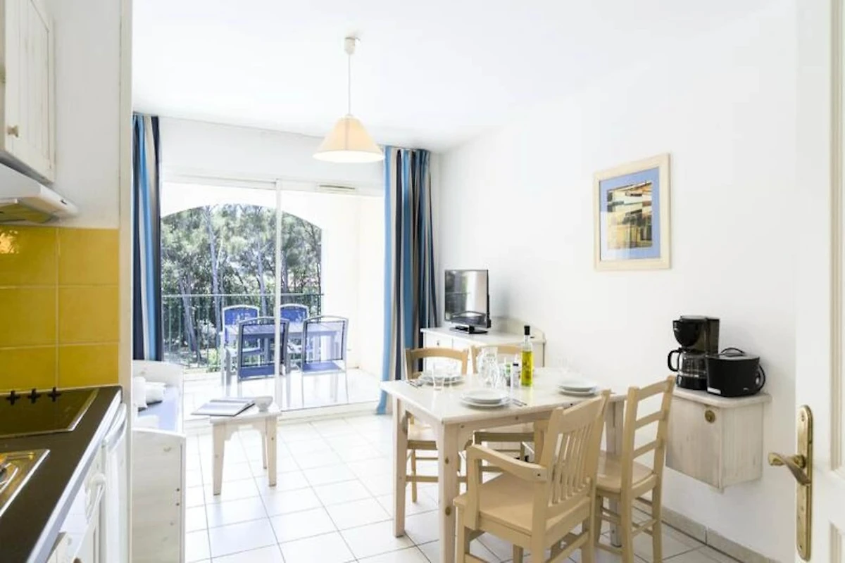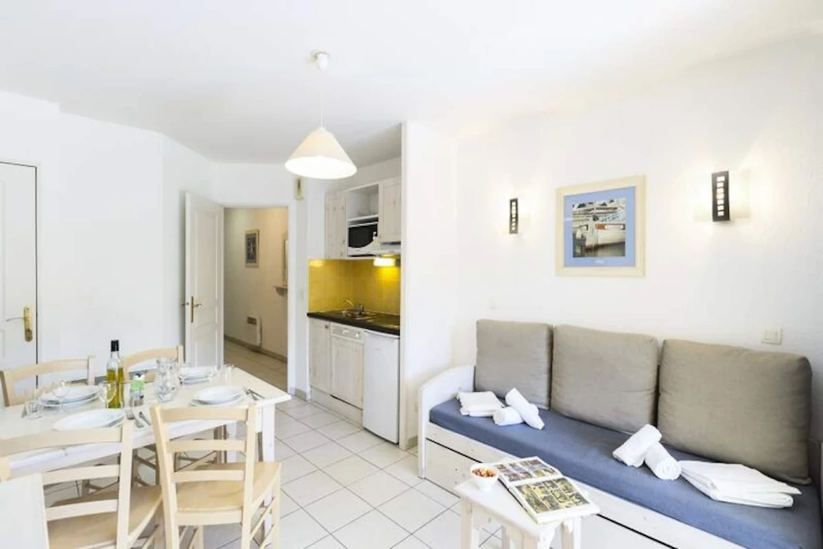 Dieses charmante Apartment in Six-Fours-les-Plages bietet einen komfortablen und einladenden Aufenthalt für bis zu 4 Personen. Es verfügt über ein Wohnzimmer mit ausziehbarer Schlafcouch, eine gemütliche Kabine mit Doppelbett und eine gut ausgestattete Küchenzeile. Die Unterkunft ist gegen einen geringen Aufpreis haustierfreundlich, sodass Ihre vierbeinigen Freunde Sie bei Ihrem Urlaub am Meer begleiten können. Ein Badezimmer mit WC ist ebenfalls vorhanden. Bettwäsche und Handtücher werden gestellt. In der gesamten Unterkunft steht Ihnen kostenfreies WLAN zur Verfügung, sodass Sie während Ihres Besuchs stets in Verbindung bleiben.