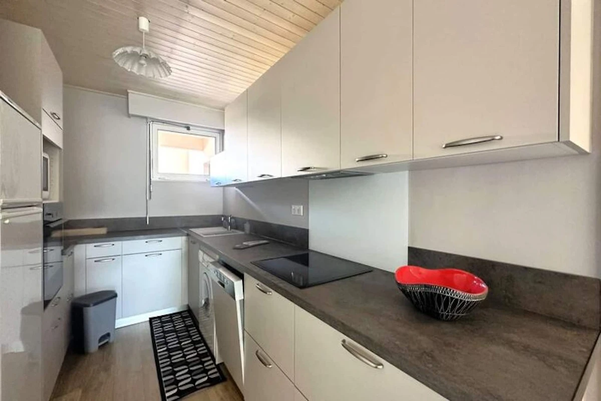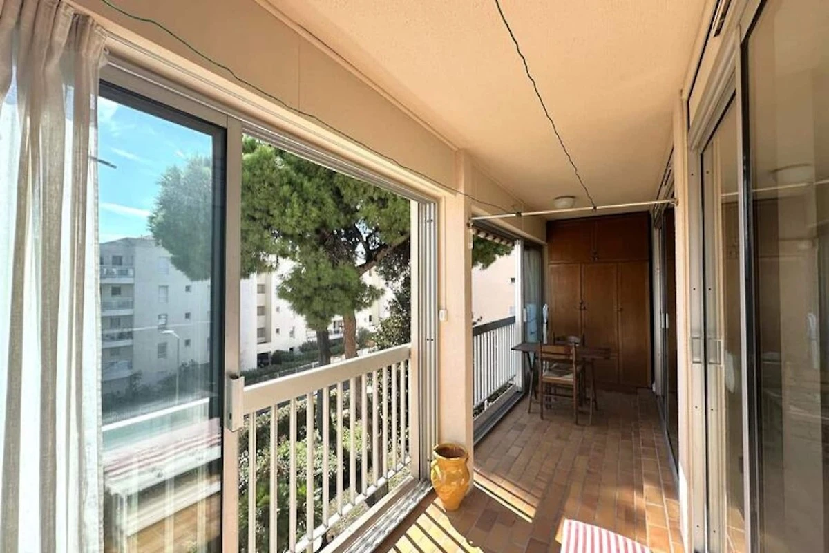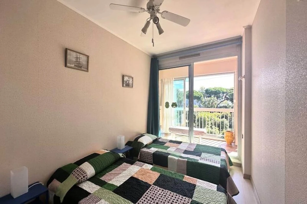 Dieses 54 m² gro�e Apartment befindet sich im 3. Stock einer sicheren Residenz und bietet Platz f�r bis zu 6 Personen. Es verf�gt �ber zwei Schlafzimmer, eines mit einem Doppelbett und das andere mit zwei Einzelbetten, beide mit Zugang zur Terrasse. Das Wohn-/Esszimmer verf�gt �ber ein Schlafsofa, einen Fernseher und eine Klimaanlage. Die Wohnung ist eine Nichtraucherwohnung und Haustiere sind nicht gestattet. Zu den weiteren Annehmlichkeiten gehצren Ventilatoren, Waschmaschine, Geschirrsp�ler und Kaffeemaschine. Den Gהsten steht eine Garage zur Verf�gung. Eine Kaution und eine Kurtaxe sind vor Ort zu entrichten.