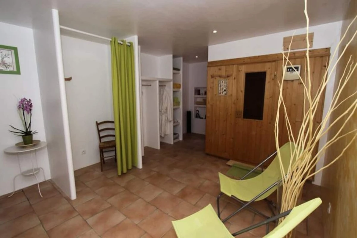 Das Anwesen liegt inmitten von sechs Hektar üppiger Natur und ist Teil der Domaine de la Haute Maure, einem wunderschönen Anwesen mit Steineichen, Pinien und mediterraner Vegetation. Der gemeinsame beheizte Pool (15 x 5 Meter) ist nur 100 Meter entfernt und Sie können die ruhige Umgebung für einen Zen- und Natururlaub genießen. Zur Entspannung bietet die Unterkunft Zugang zu einem Spa mit Sauna, Hamam und Whirlpool (nach Vereinbarung).