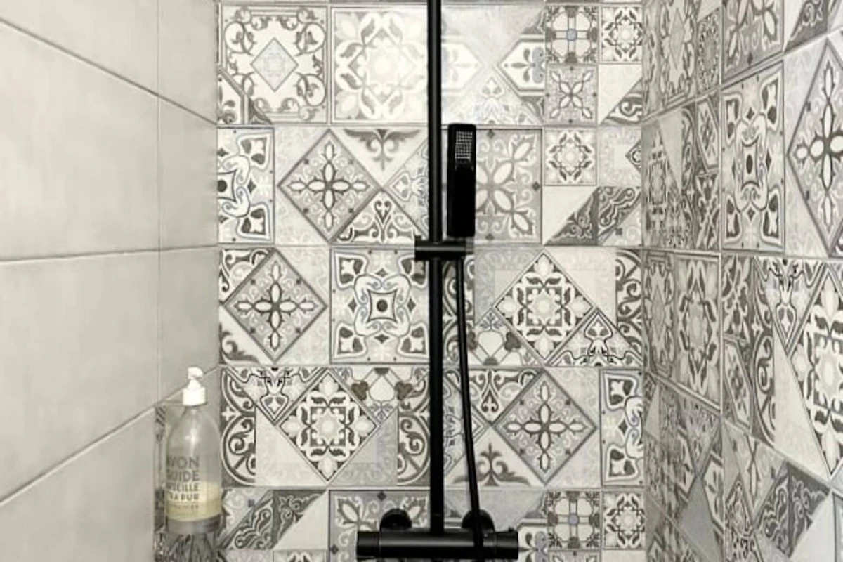 De doucheruimte, waarvan de sfeer wordt bepaald door cementtegels en zwarte apparatuur, combineert functionaliteit en functionaliteit. en ontspanning. Voorzien van een stijlvolle wastafel, spiegel, verwarmd handdoekenrek, haardroger en vooral een inloopdouche. de Italiaan met zijn handdouche biedt momenten van revitaliserend welzijn. De zorgvuldige afwerking en de materiaalkeuze geven het een unieke uitstraling. Deze ruimte heeft een uniek karakter en belooft een unieke ervaring. zowel modern als ontspannend.