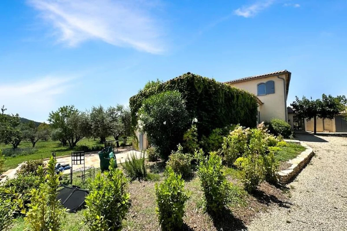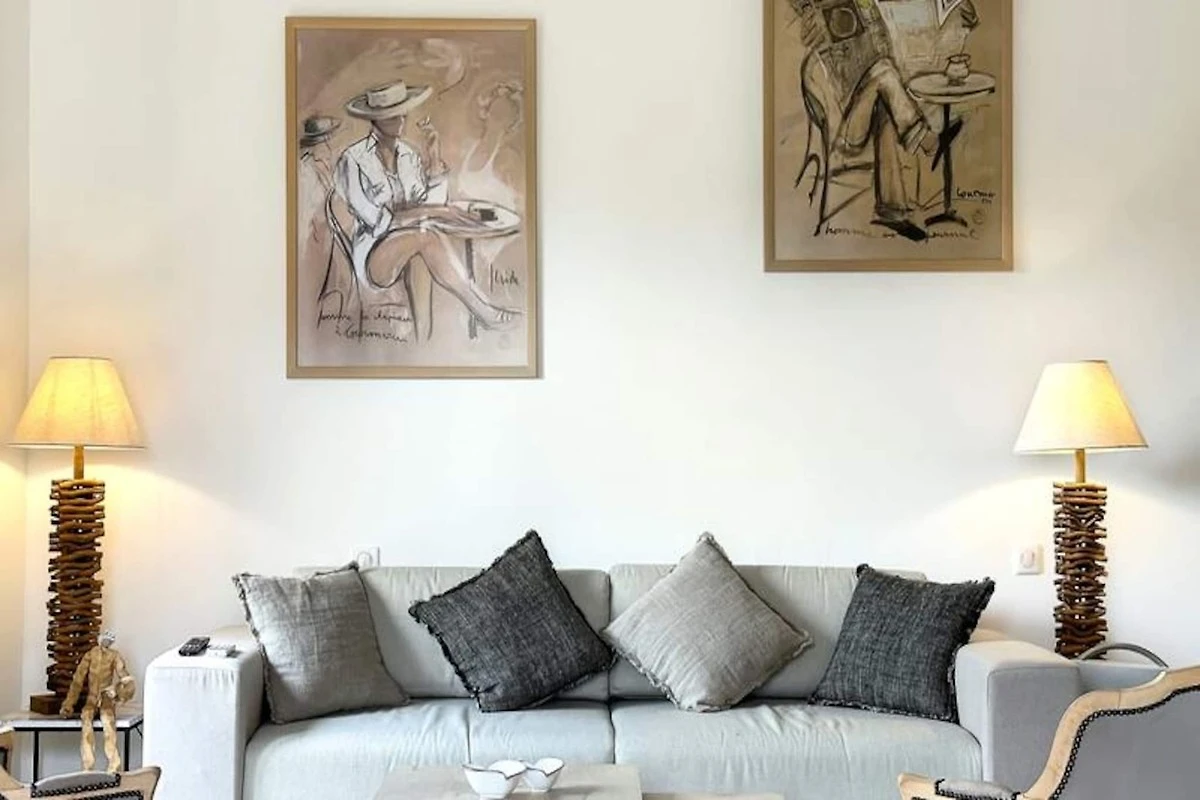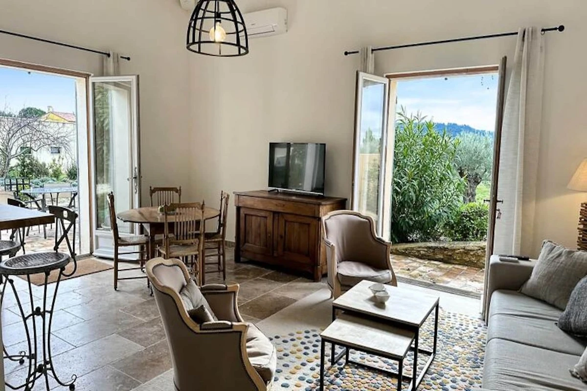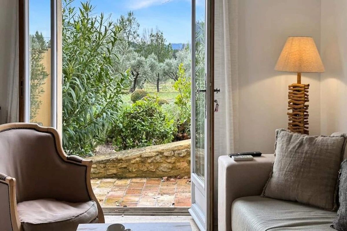 In de woonkamer maak je het jezelf gemakkelijk op de grote bank, omgeven door zachte kussens, of kies je voor één van de twee fauteuils om je onder te dompelen in een boek. De sfeer wordt nog warmer gemaakt door lampen aan het uiteinde van de bank. en schilderijen van een beroemde lokale kunstenaar sieren de muren. Glazen deuren aan weerszijden De woonkamer geeft uit op een groene tuin en een terras, dat een rustig ontbijt of een zonnig aperitief belooft, in een typisch Provençaalse omgeving. Dit privéterras, op het zuidoosten, is uitgerust met tafels, stoelen en houten ligstoelen voor uw momenten van ontspanning of uw buitenmaaltijden.