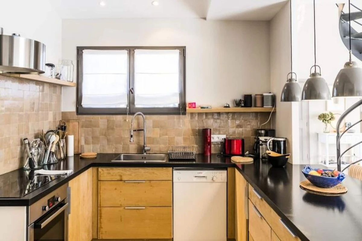 Dankzij de open keuken naar de woonkamer kunt u samen maaltijden bereiden en ervan genieten. De woonkamer beschikt over een bank. comfortabel om te ontspannen in de heetste uren. Gratis WiFi door het hele huis om verbonden te blijven. (geen televisie).