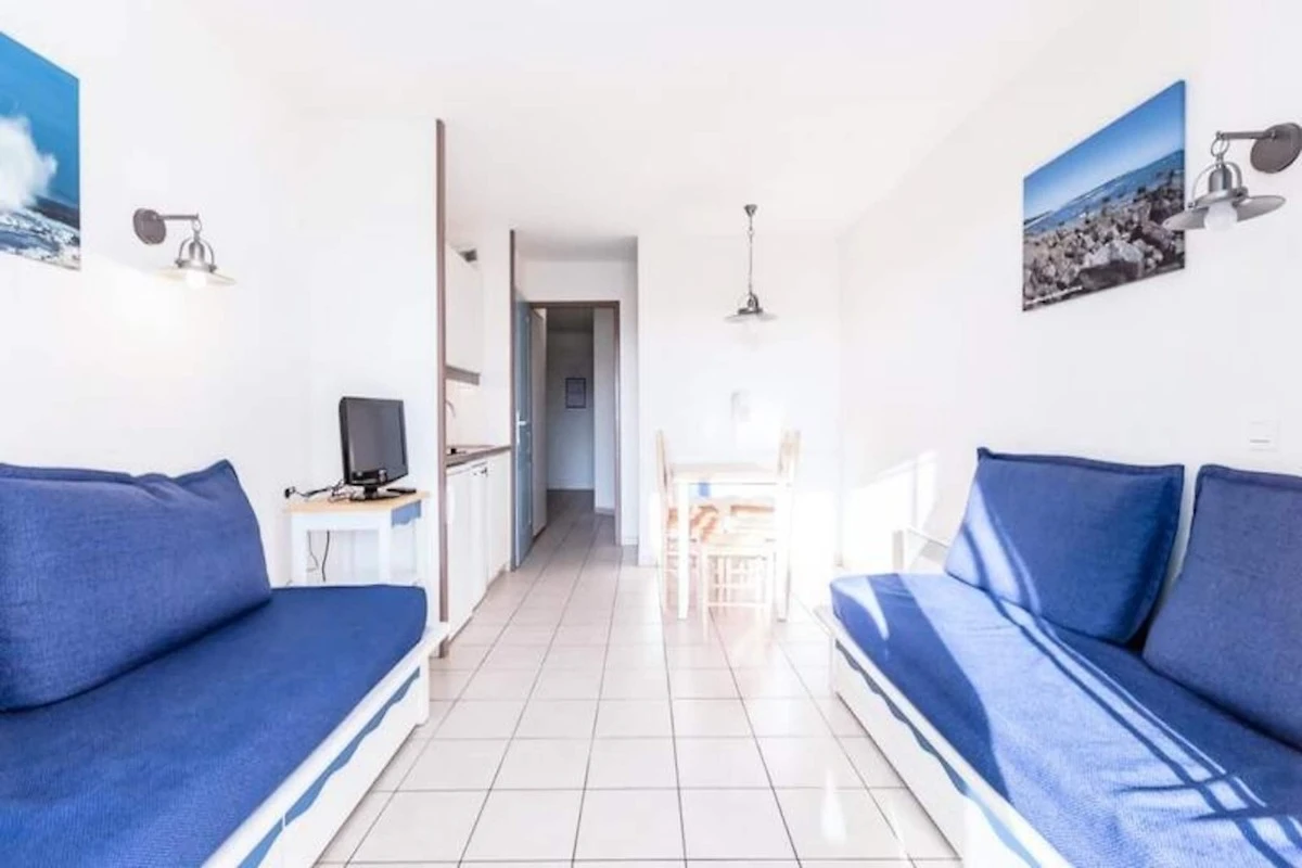 Dieses gemütliche Feriendomizil bietet einen ruhigen Rückzugsort umgeben von natürlicher Schönheit und praktischen Annehmlichkeiten. Das Apartment bietet Platz für bis zu 5 Gäste und verfügt über ein Schlafzimmer mit Doppelbett und ein Wohnzimmer mit zwei Schlafsofas, darunter eines mit einem Ausziehbett. Die im Erdgeschoss gelegene Immobilie verfügt über eine nach Süden ausgerichtete, möblierte Terrasse mit malerischem Blick auf den Golfplatz. Haustierfreundliche Unterkünfte sind auf Anfrage und gegen Aufpreis verfügbar. Die Residenz bietet außerdem kostenlose Parkplätze vor Ort und Zugang zu mehreren beheizten Swimmingpools mit Rutschen und einem Planschbecken.