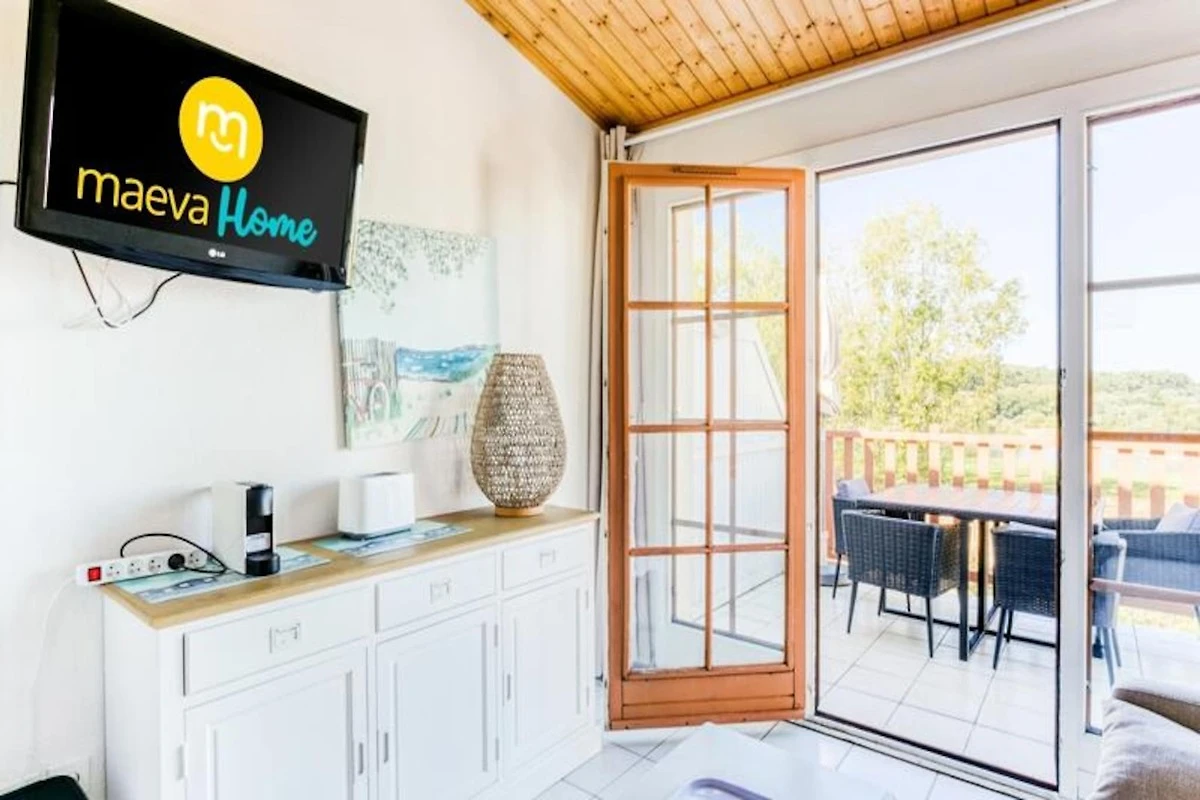 Die Residenz liegt auf einem 90 Hektar großen, von Pinienwäldern umgebenen Anwesen und bietet einfachen Zugang zum Meer über Wander- oder Radwege. Sie können auch einen Shuttle zum nur 2,5 km entfernten Strand von Veillon nehmen. Die Gegend bietet verschiedene Freizeitaktivitäten, darunter zwei 18-Loch-Golfplätze, Tennis, Minigolf und mehrere Schwimmbäder. Die nahe gelegene Stadt Talmont-Saint-Hilaire bietet eine Vielzahl von Geschäften, Cafés und Restaurants, sodass alles, was Sie für einen komfortablen Aufenthalt benötigen, in Reichweite ist.