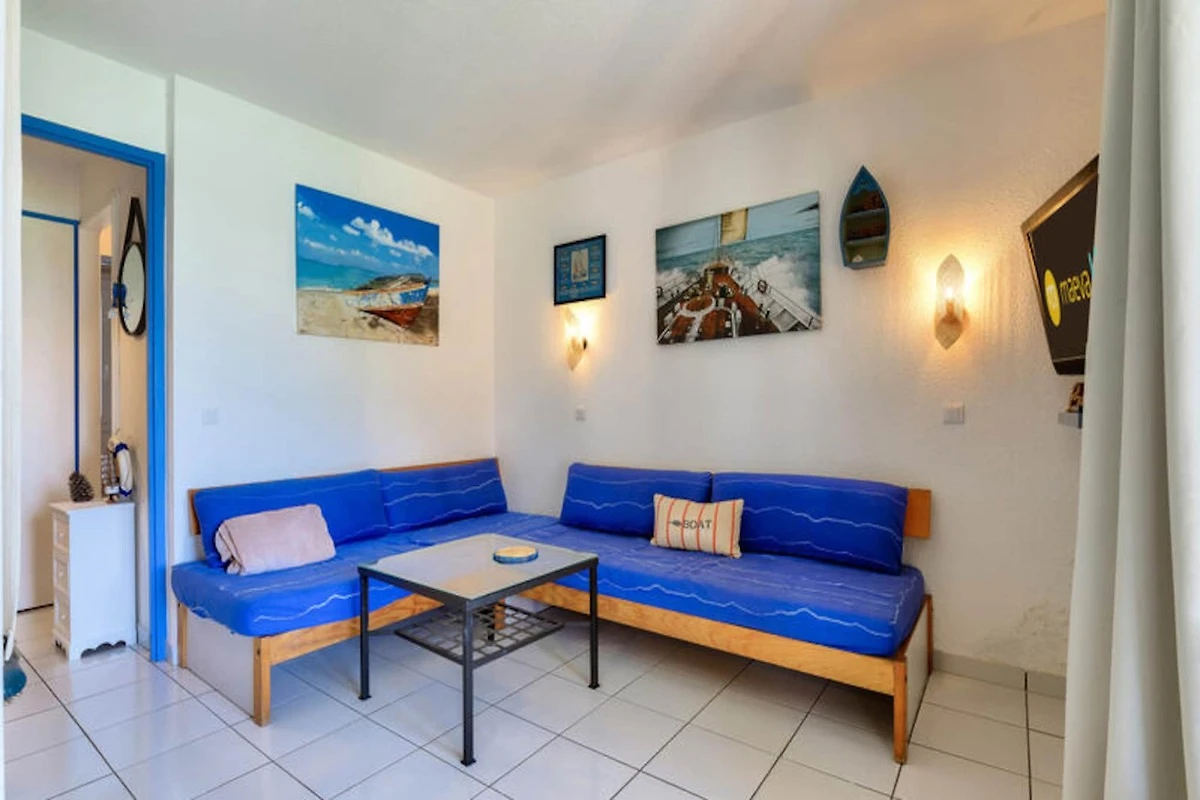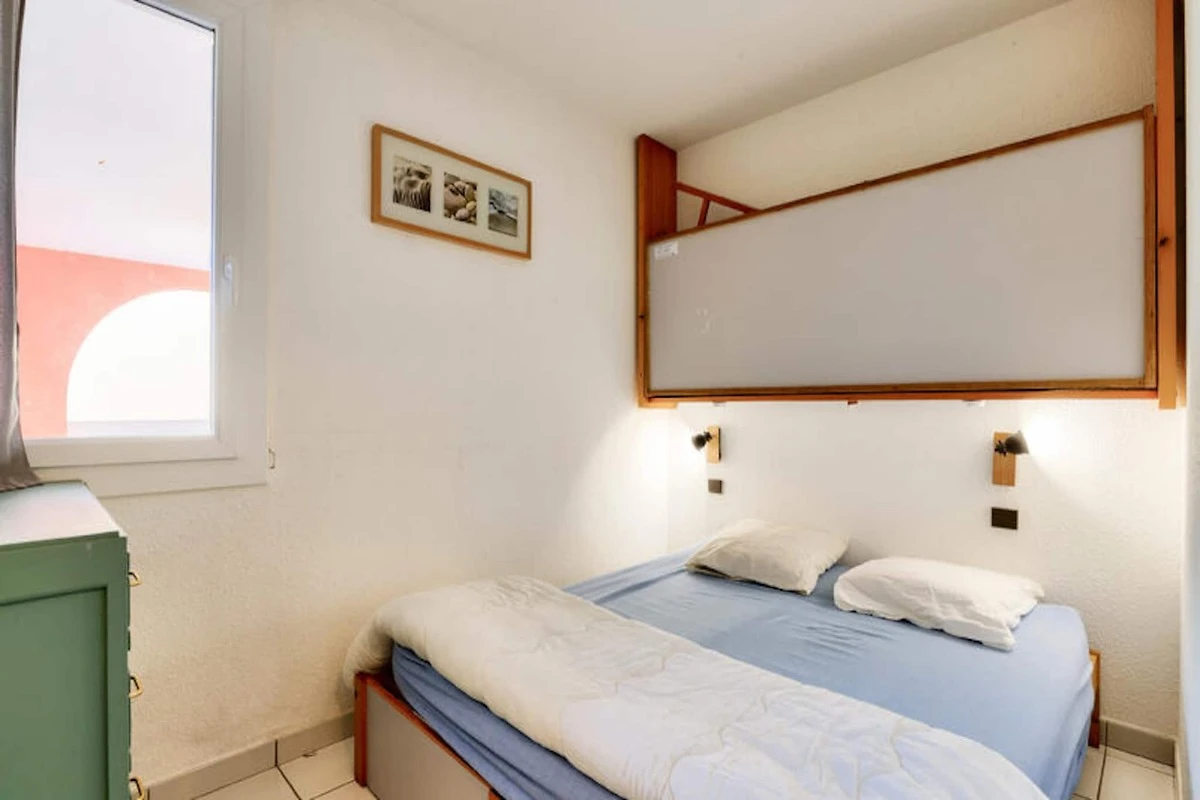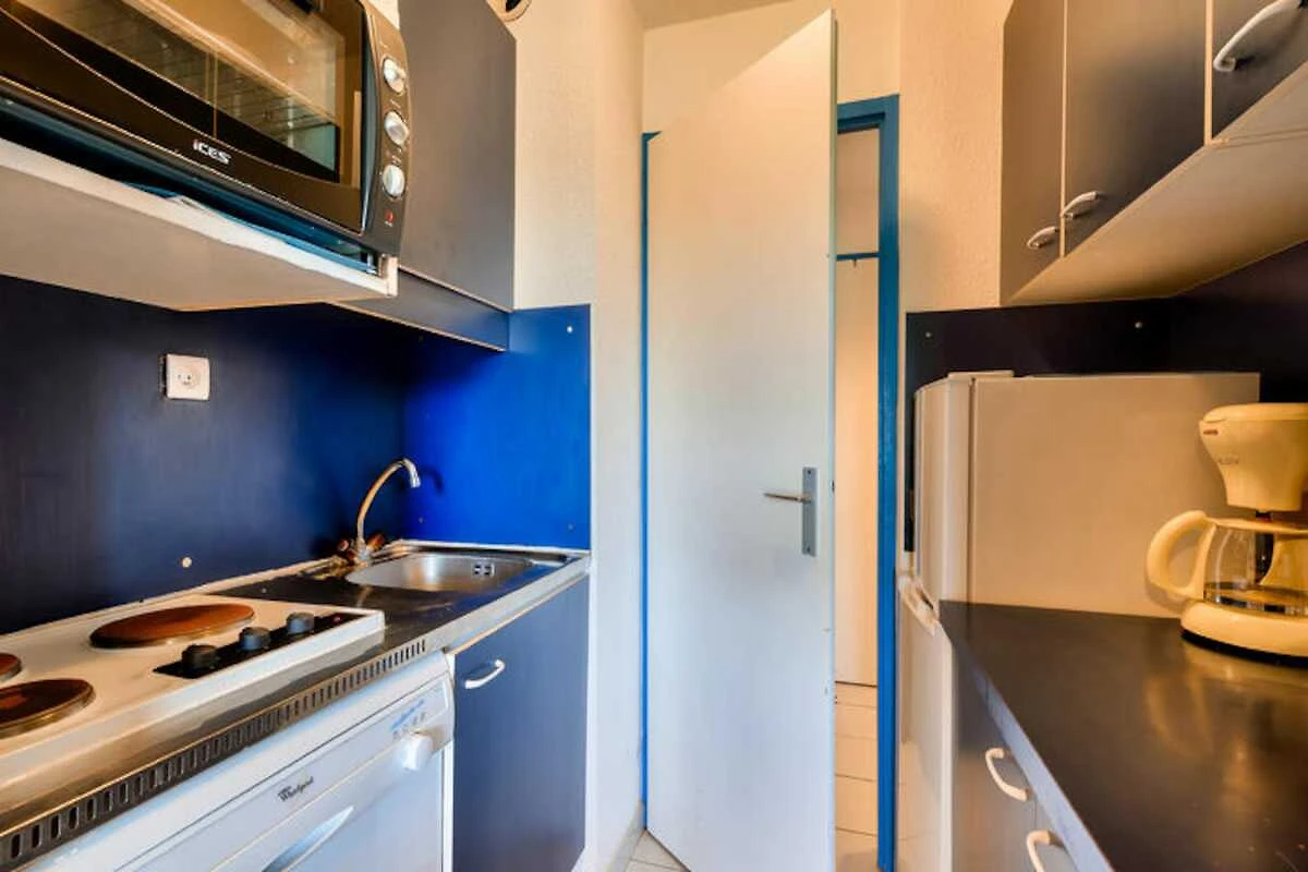 Das Apartment verfügt über eine halboffene Küche, die mit den wichtigsten Geräten wie einer Mikrowelle und einem Backofen ausgestattet ist und die Zubereitung von Mahlzeiten erleichtert. Das Badezimmer verfügt über eine Badewanne mit Säule und es gibt ausreichend Stauraum für Ihre Sachen. Vor Ort finden Sie beheizte Pools, Rutschen und ein Planschbecken für Familienspaß. Mit seiner erstklassigen Lage und zahlreichen Annehmlichkeiten eignet sich dieses Apartment perfekt für einen erholsamen Urlaub.