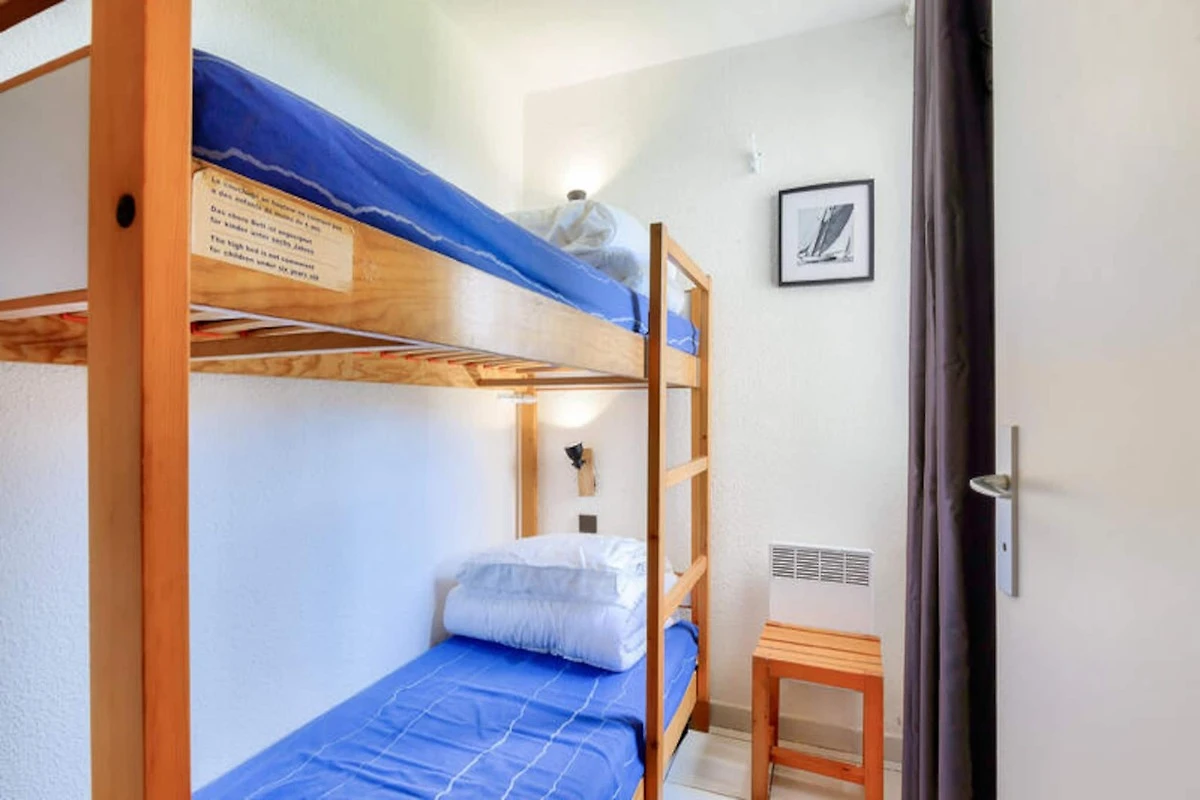 Diese charmante Ferienwohnung ist ideal für bis zu 5 Gäste und bietet einen komfortablen Aufenthalt mit einem Schlafzimmer mit Doppelbett, einem Kabinenbereich mit Etagenbetten, einem Wohnzimmer mit Schlafsofa und einem Badezimmer mit Badewanne. Das Apartment ist haustierfreundlich (es können zusätzliche Gebühren anfallen). Bettwäsche und Handtücher sind gegen Aufpreis erhältlich. Für zusätzlichen Komfort fällt eine Endreinigungsgebühr an. Parkplätze stehen vor Ort zur Verfügung. Das Apartment verfügt über eine überdachte Terrasse mit Blick auf das Dorf, ideal zum Entspannen nach einem erlebnisreichen Tag.