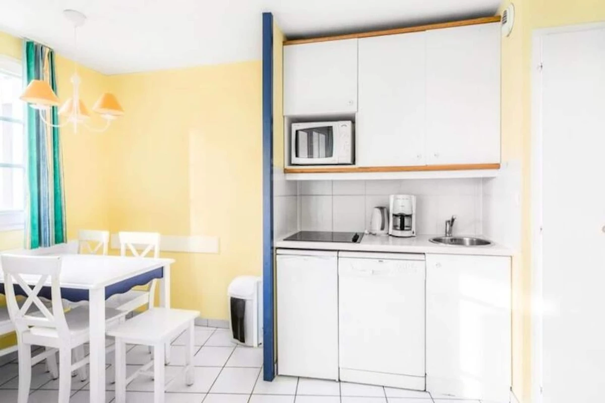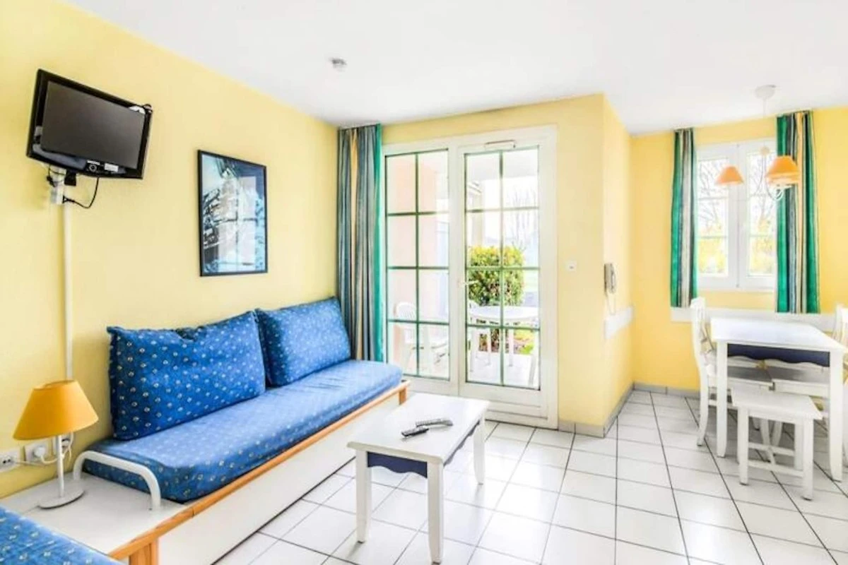 Dieses Apartment im Erdgeschoss bietet einen erholsamen Rückzugsort auf einem 90 Hektar großen Anwesen in Talmont-Saint-Hilaire mit Blick auf einen See und umgeben von einem Pinienwald. Die Fußgängerzone umfasst Geschäfte und gastronomische Einrichtungen. Drei Schwimmbecken mit Rutschen stehen zur Verfügung (saisonale Öffnungszeit). Der Strand ist zu Fuß, mit dem Fahrrad oder mit dem Shuttle (2,5 km) erreichbar. Golf, Tennis und Minigolf stehen gegen Gebühr zur Verfügung. Haustiere sind erlaubt (gegen Gebühr).
