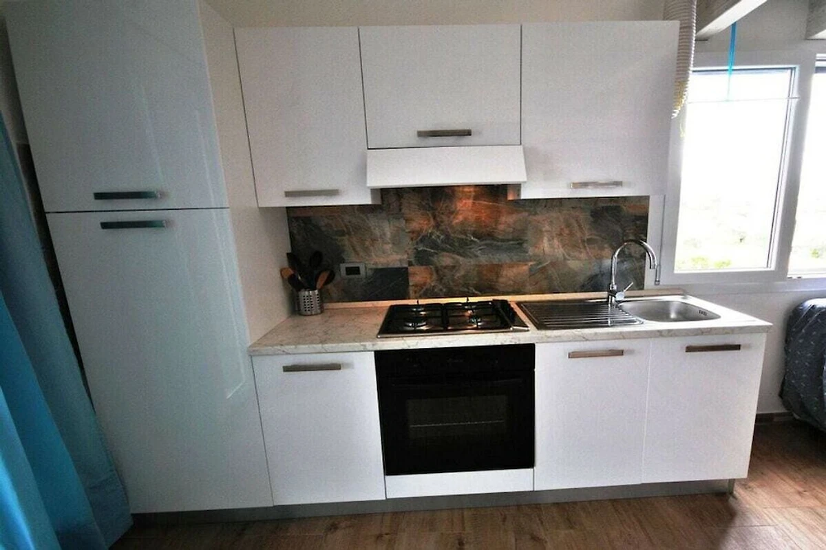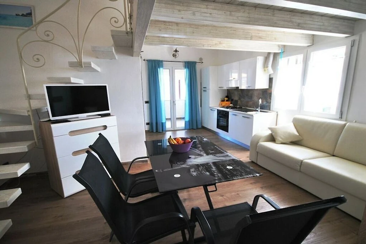 Mezzanine mit Doppelbett (160 x 200), Wohnküche mit Doppelschlafsofa, Badezimmer mit Dusche/WC/Bidet. Aufzug und Parkplatz in der Tiefgarage.