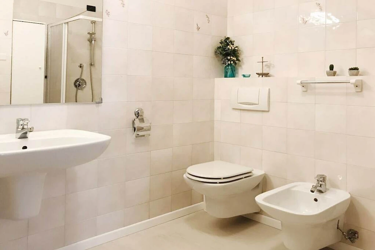 In der 1. Etage: (Badezimmer(, Toilette, Dusche, Waschbecken, Bidet))