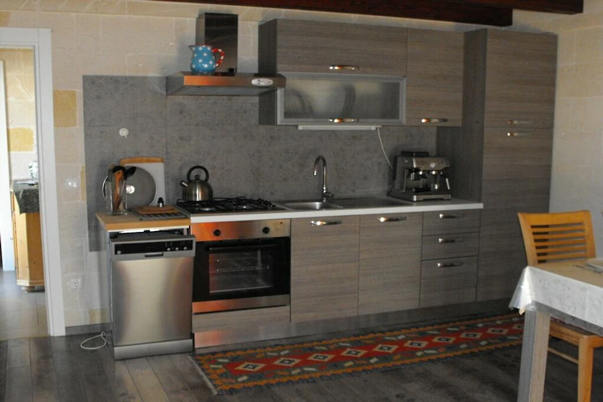 Unser luxuriös, liebevoll autarkes, nachhaltig restauriertes „Trullohäuschen", ist für jede Jahreszeit gerüstet. Klimaanlage zum Kühlen und Heizen. Es verfügt über ein Schlafzimmer, Bad mit Dusche, WC und Waschmaschine. Der Wohnbereich mit großzügiger Küchenzeile, Geschirrspüler und Essplatz, sowie eine bequeme Ecke mit Schlaf- Sofa für zwei Personen, SAT TV und WLAN. Zusätzlich kann ein (Kinder-) oder Beistellbett aufgestellt werden; das Ferienhaus ist mit allen Dingen des täglichen Komforts ausgestattet.