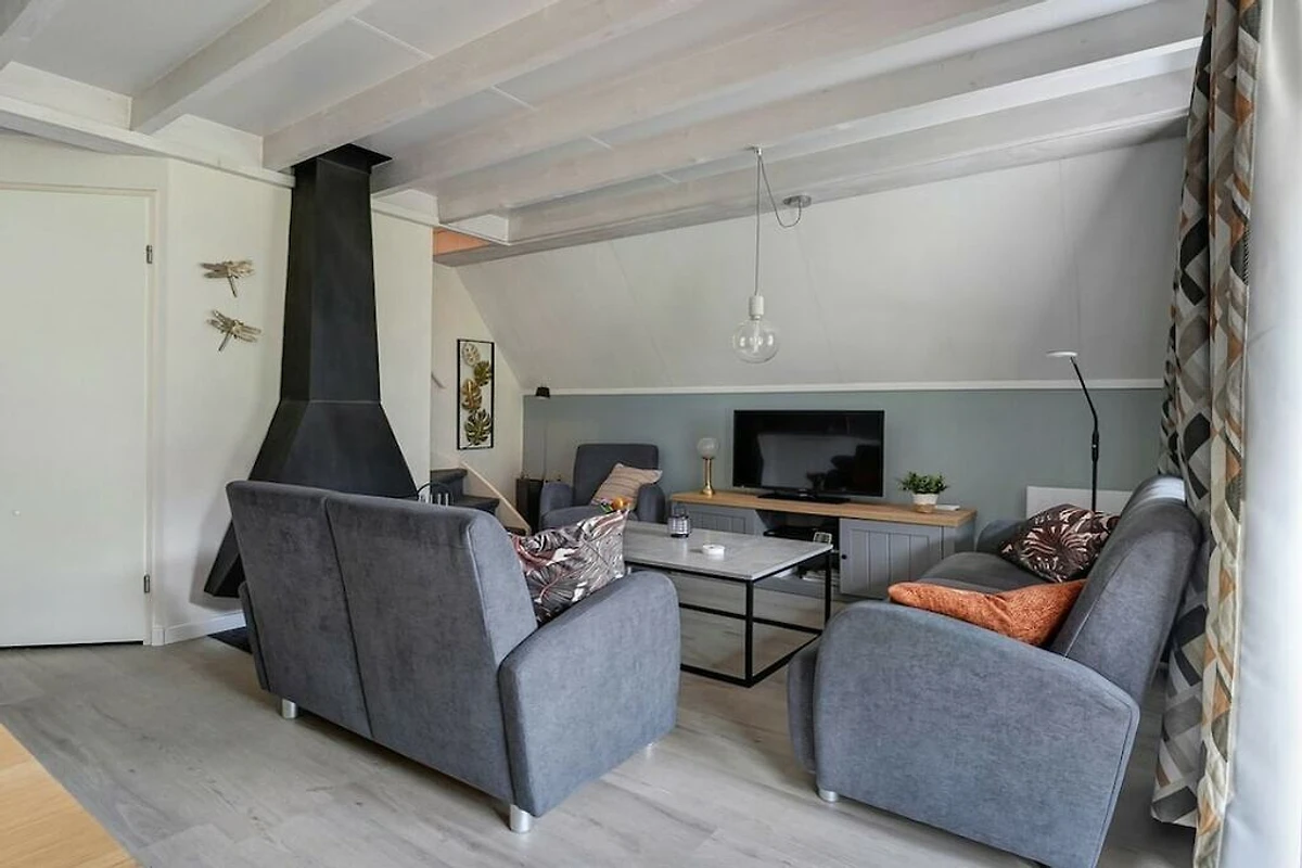 Dieses freistehende 6-Personen-Ferienhaus verfügt ein Wohnzimmer mit einem gemütlichen Ess- und Wohnbereich. Der Wohnbereich verfügt über einen Kamin und die offene Küche ist vollständig ausgestattet (Geschirrspüler, Filterkaffeemaschine und Kombi-Mikrowelle). Im Erdgeschoss befindet sich ein Schlafzimmer mit zwei Einzelbetten.