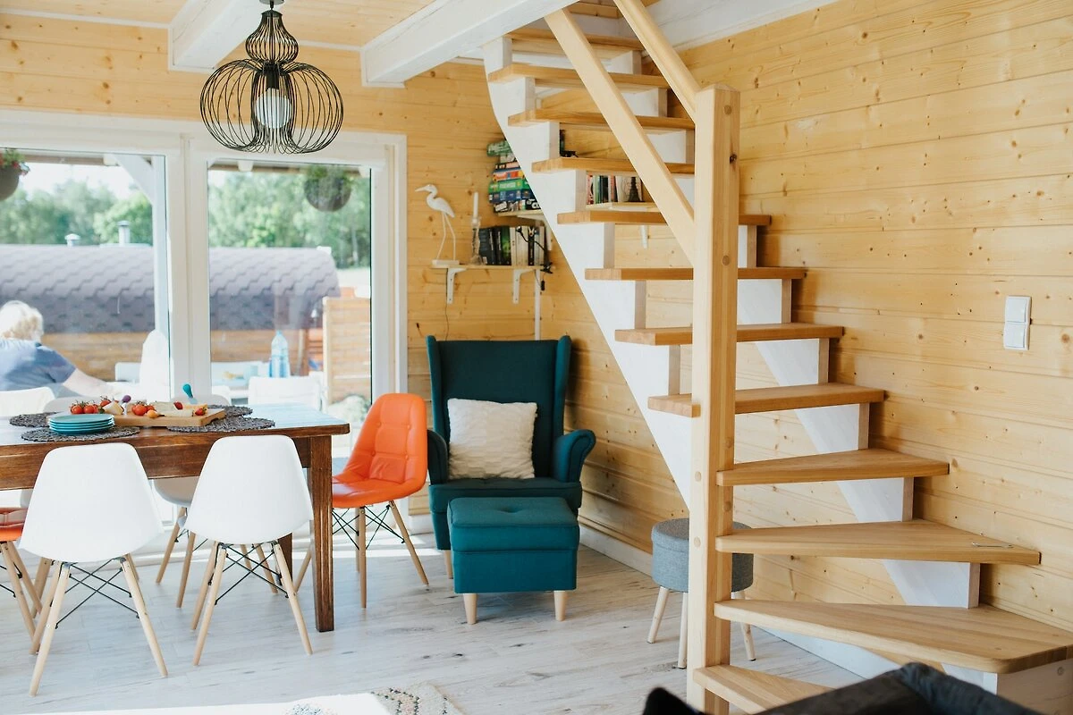 Das Haus erstreckt sich über zwei Etagen. Im Erdgeschoss befinden sich ein Wohnzimmer mit Essbereich, eine offene Küche, ein Schlafzimmer mit eigenem WC und ein Badezimmer mit Dusche und Bidet. Im Obergeschoss erwarten Sie zwei Schlafzimmer sowie eine Galerie mit zwei Matratzen.