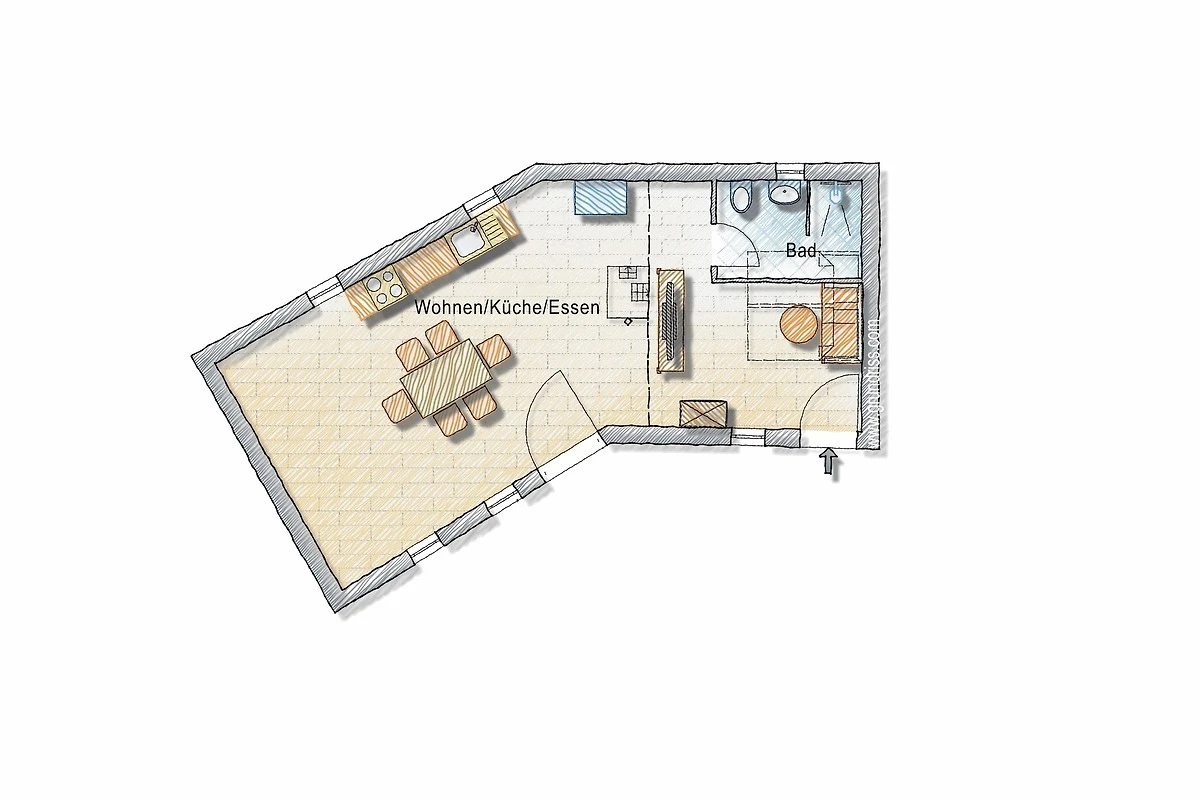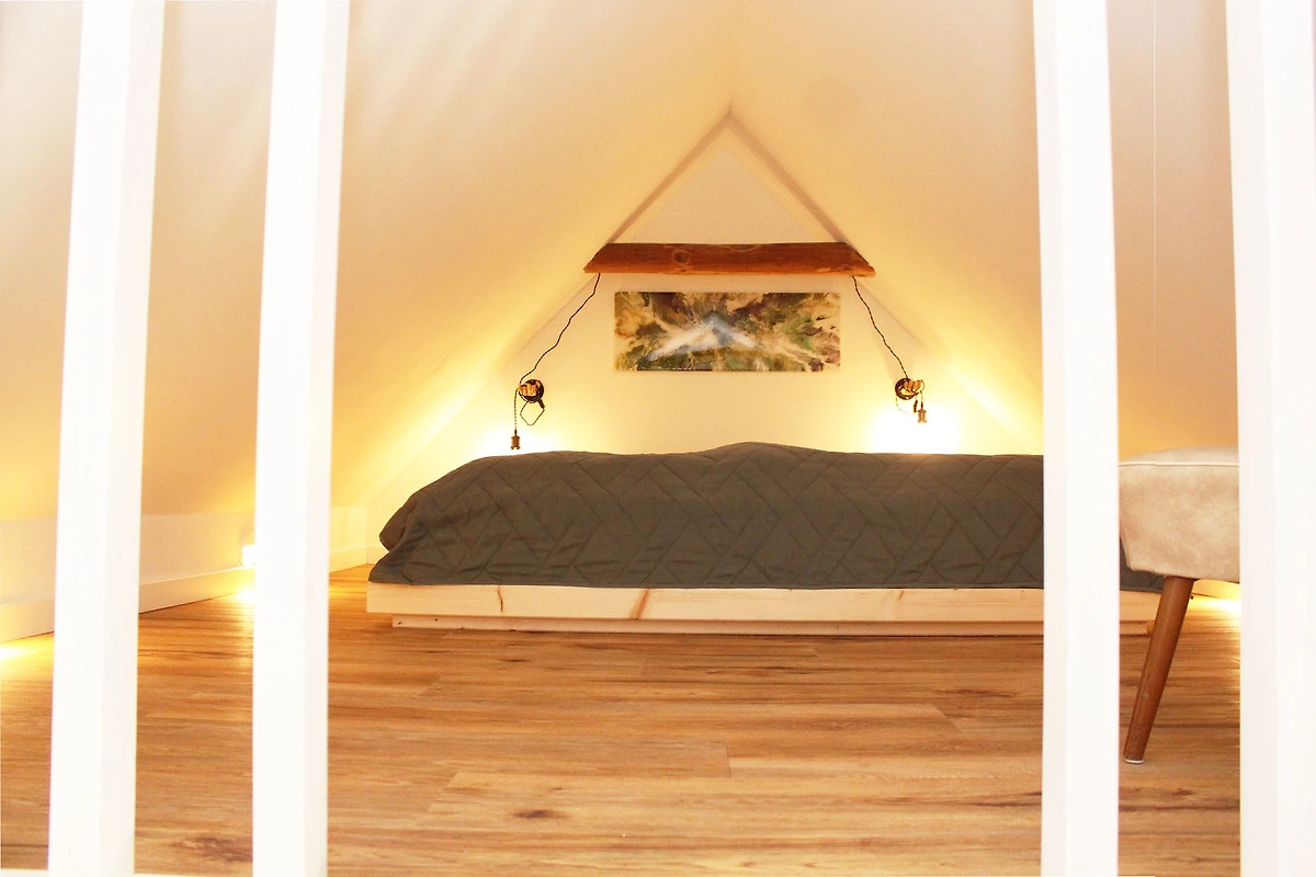 Im Erdgeschoss erwartet Sie ein grosszügiger Wohnraum mit gemütlicher Sitzecke (inkl. TV) und grossem Esstisch. Die voll ausgestattete Küchenzeile ist in den Wohnraum integriert, der mit besonderem Flair bis in den Giebel offen ist. Hier macht das Kochen auch im Urlaub Spass! Der Kamin sorgt für wohlige Wärme und Gemütlichkeit. Über einen in den Kamin integrierten Aufstieg (Leiter) gelangen Sie auf den Schlafboden. Hier steht unter dem Spitzdach ein Doppelbett für erholsame Stunden bereit. Das moderne Bad ist mit einer bodengleichen Dusche ausgestattet.