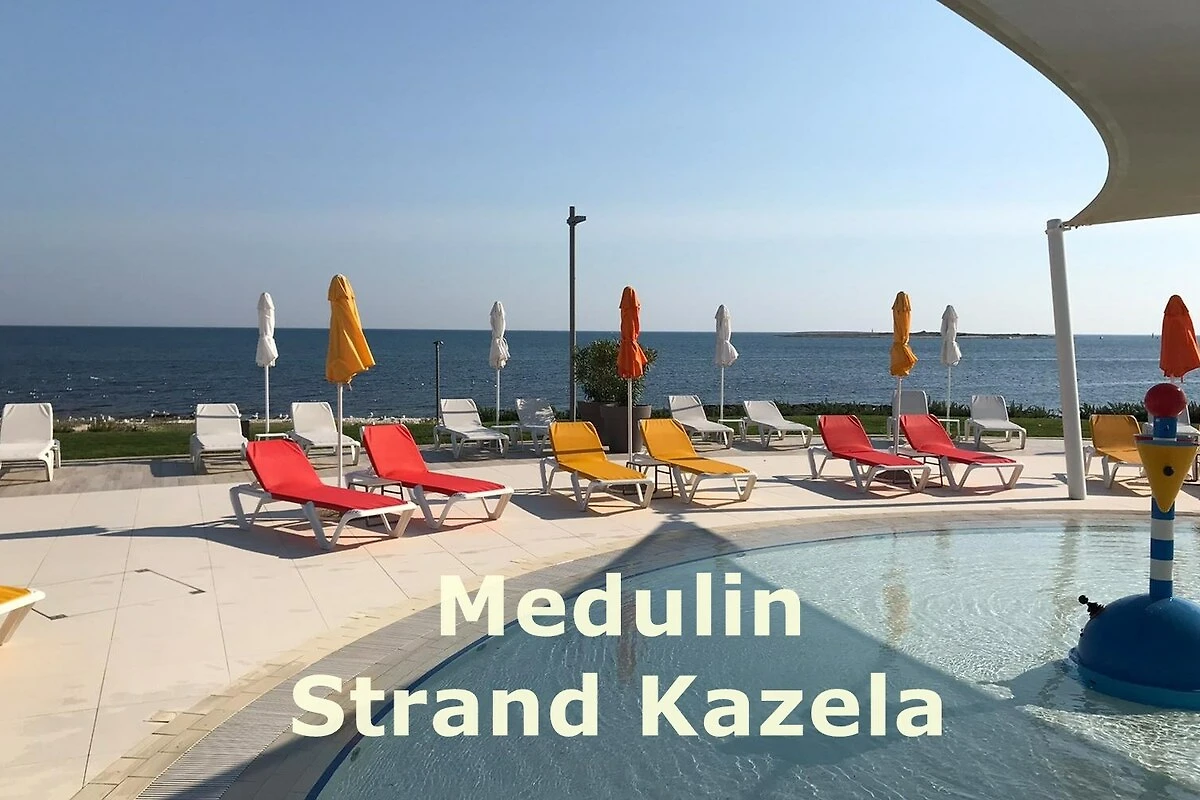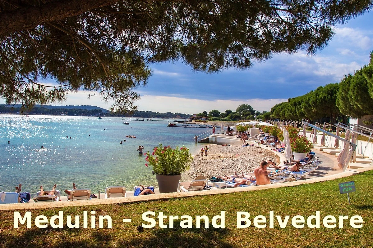 Medulin – nur 5 Minuten zum Strand: Ferienhaus Anto liegt in Medulin strandnah, ca. 300 m zum Strand Holiday – 400 m zu den Stränden Belvedere, Alba Chiara und Sandstrand Bjeca! Sehr zentrale Lage - von hier aus kommt man in Medulin einfach überall zu Fuss hin: Hafenpromenade, Shopping, Lunapark, Familypark, Camp Medulin u.v.m. Das Auto kann auf dem hauseigenen Parkplatz stehen bleiben. In wenigen Minuten ist man in der Mitte der Hotelstrände - beim Bootsverleih. Alle Strände in Medulin sind gebührenfrei nutzbar!