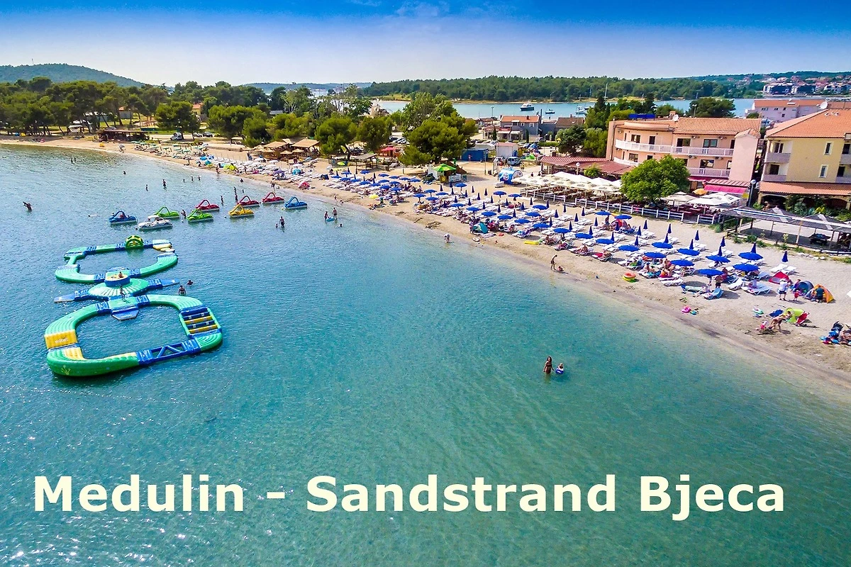 Medulin – nur 5 Minuten zum Strand: Ferienhaus Anto liegt in Medulin strandnah, ca. 300 m zum Strand Holiday – 400 m zu den Stränden Belvedere, Alba Chiara und Sandstrand Bjeca! Sehr zentrale Lage - von hier aus kommt man in Medulin einfach überall zu Fuss hin: Hafenpromenade, Shopping, Lunapark, Familypark, Camp Medulin u.v.m. Das Auto kann auf dem hauseigenen Parkplatz stehen bleiben. In wenigen Minuten ist man in der Mitte der Hotelstrände - beim Bootsverleih. Alle Strände in Medulin sind gebührenfrei nutzbar!