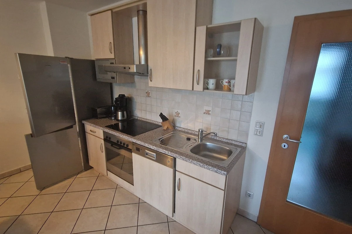 1 Wohnzimmer mit integrierter, offene „amerikanische“ Küche mit Ceranfeld und einem Geschirrspüler. Neben dem Esstisch lädt eine gemütliche Sofa-Sitzgruppe zum Verweilen ein. Eine Aufbettung ist möglich, da die Couch in ein Doppelbett umgewandelt werden kann.