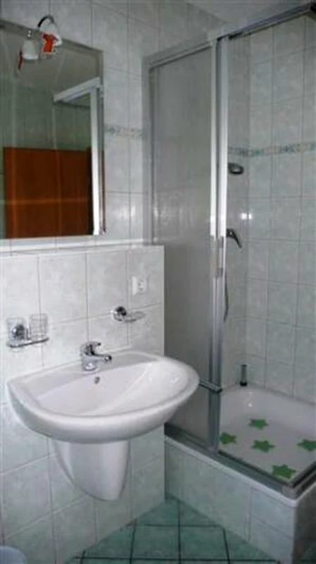 Das Badezimmer ist mit Dusche, WC und Föhn ausgestattet.
