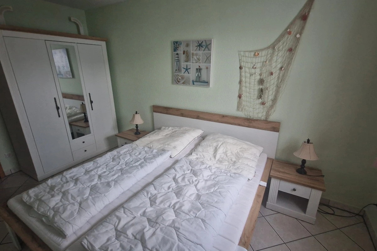 Großes Schlafzimmer mit ein gemütliches Doppelbett, ein geräumiger Kleiderschrank, sowie zwei Nachttische.