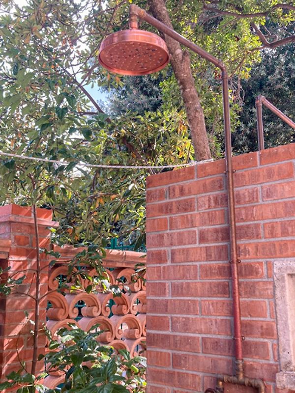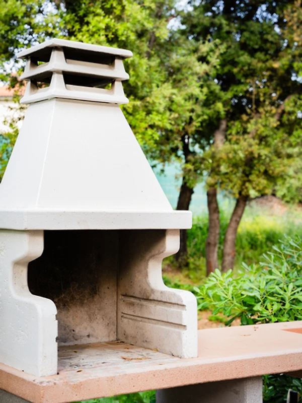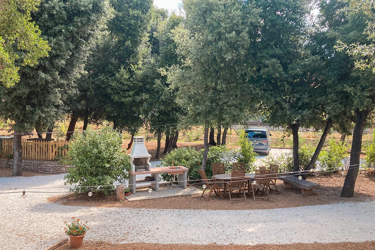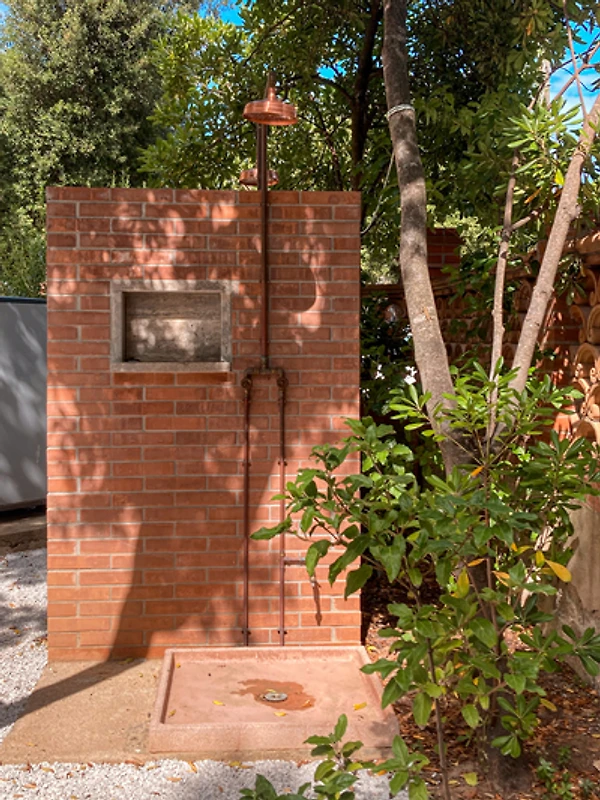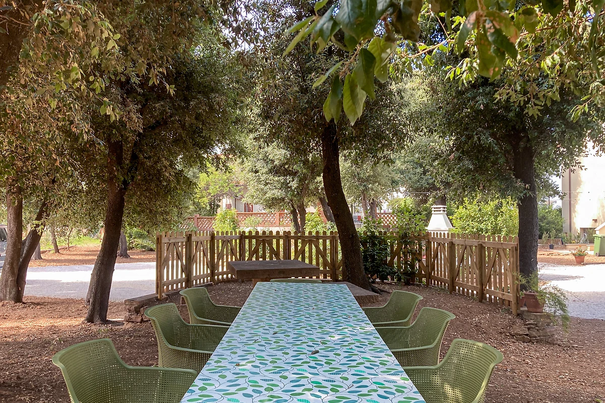 Im zentralen Gartenbereich befindet sich eine gemeinschaftliche Zone mit Außendusche mit Warmwasser, ideal zum Abspülen des Sands nach dem Strandbesuch, sowie ein Grillbereich für gesellige Abende im Freien.