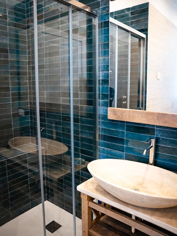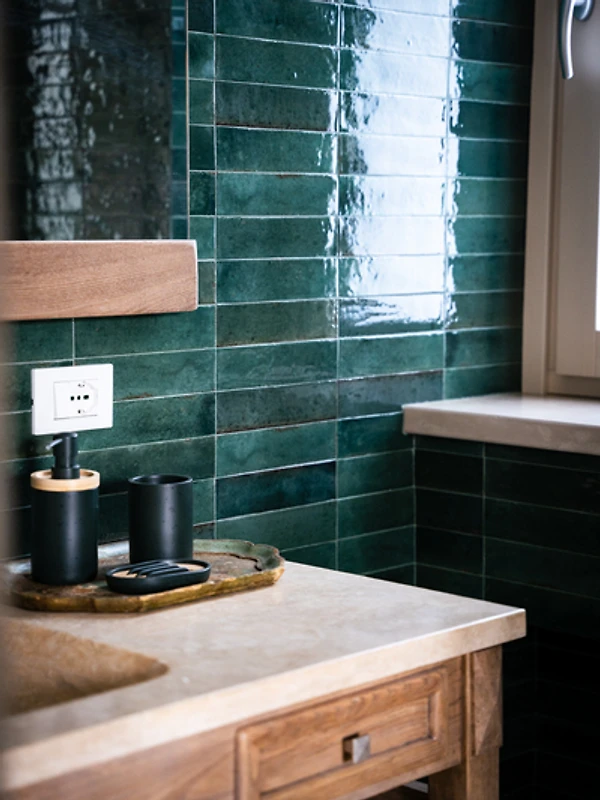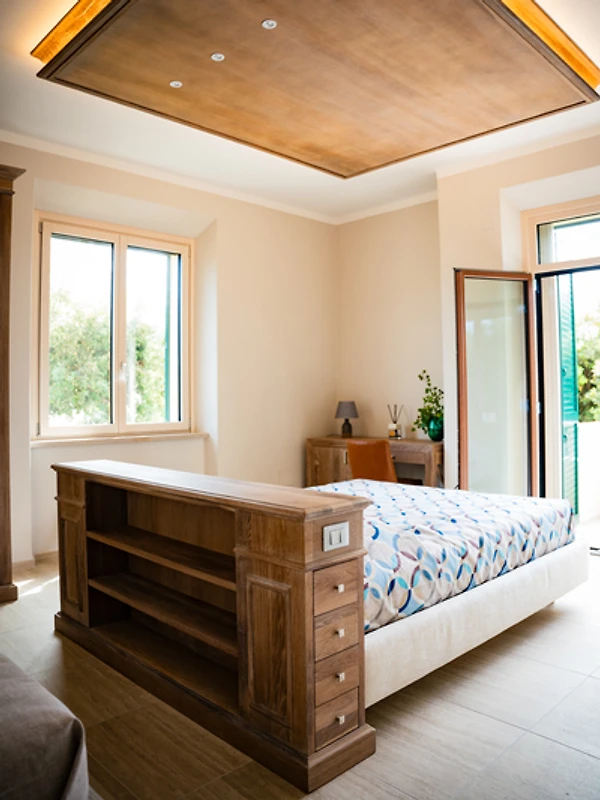 • Hochwertige, handgefertigte Möbel mit eleganten Details aus Massivholz und Travertin, die dem Ambiente eine warme und stilvolle Note verleihen