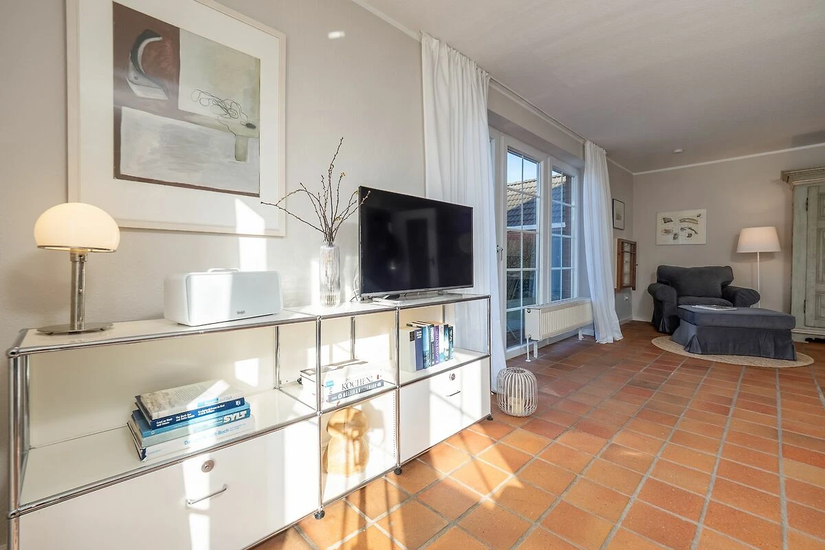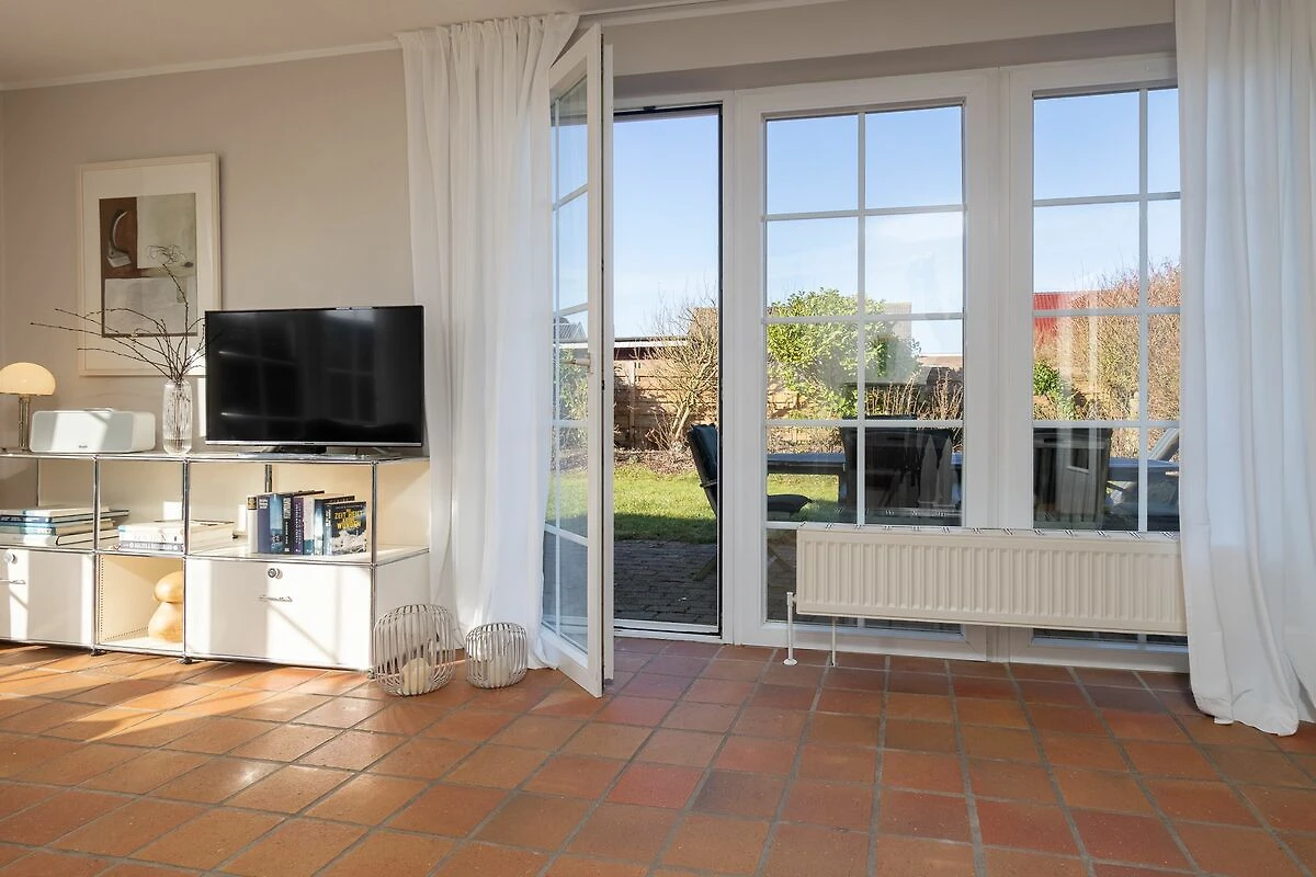 Das rund 30 m² große Wohnzimmer zeichnet sich durch zwei bodentiefe Fensterfronten, eine Sofaecke mit mehreren Sesseln, TV und Kachelofen aus. Eine zusätzliche Lese-Ecke und der Blick in den grünen Garten laden zum gemütlichen Beisammensein ein. Von hier haben Sie direkten Zugang zu gleich zwei sonnigen Terrassen (mit Süd- und West-Ausrichtung), hochwertigen Gartenmöbeln und Liegen aus Teakholz und Sylter Strandkorb. Der rundum eingezäunte Garten eignet sich hervorragend zum Spielen und Relaxen.