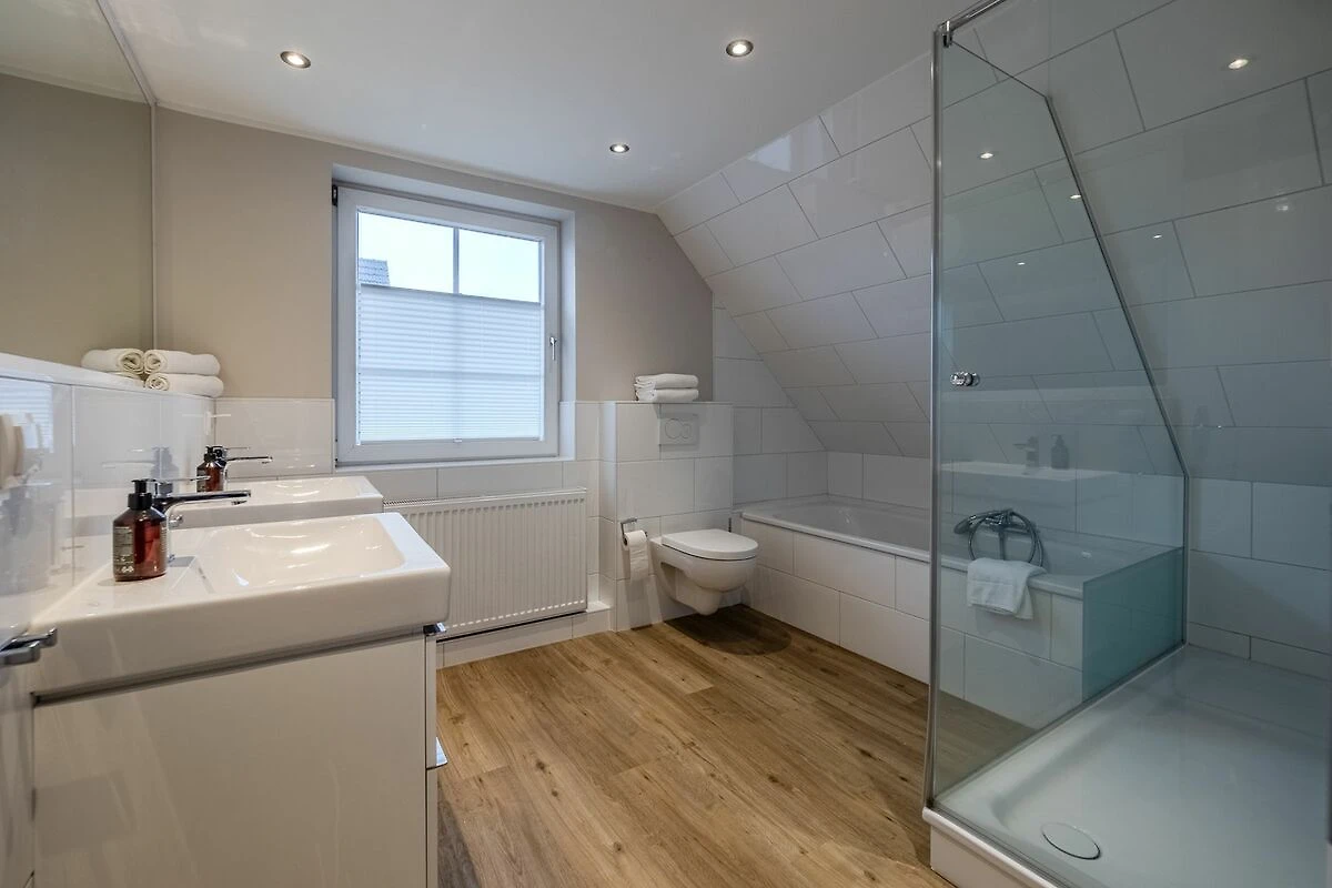 Badezimmer 2: Große und bodentiefe Dusche, Badewanne, Doppelwaschbecken, WC und Fenster.