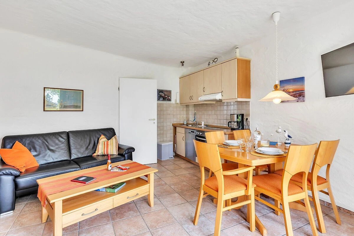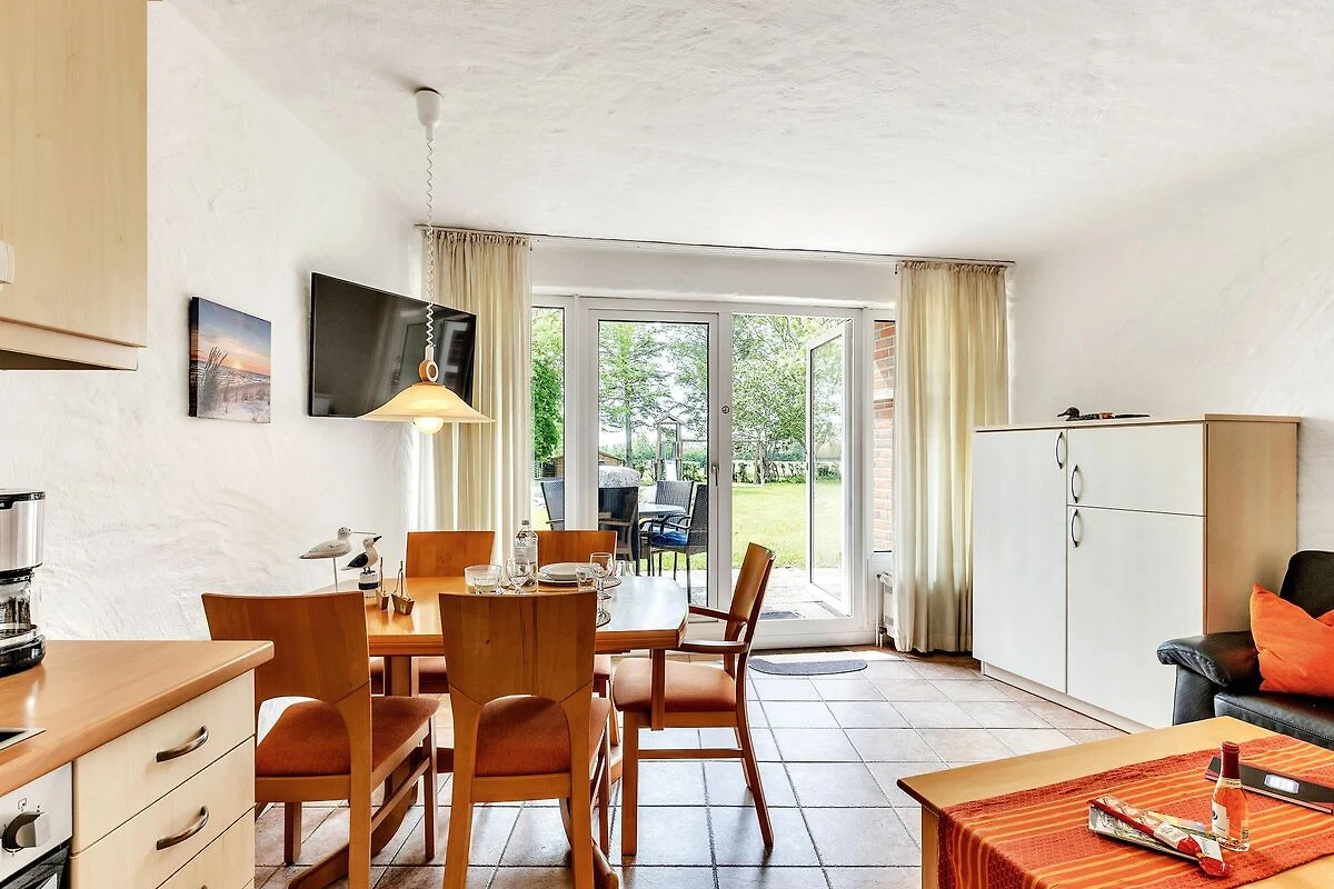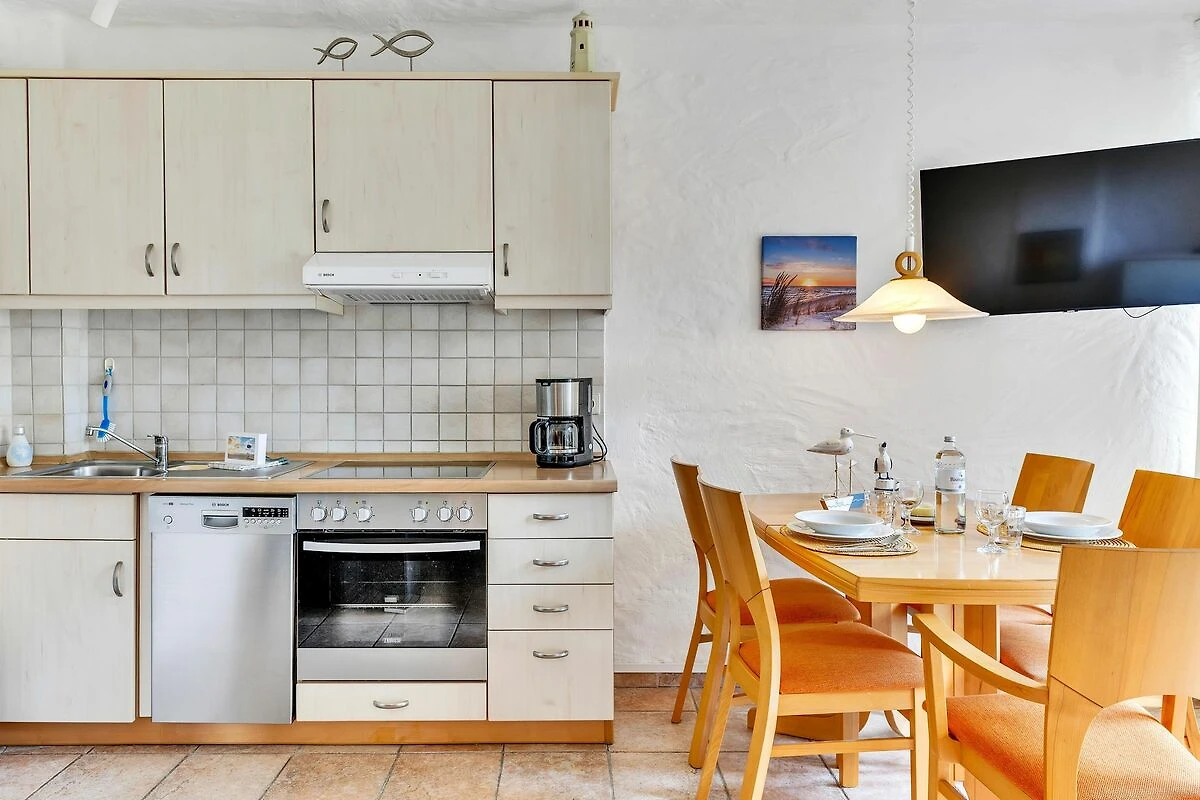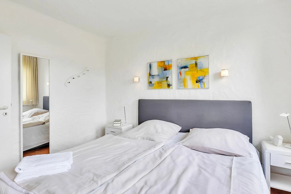 Herzlich Willkommen in Ihrem Ferienapartment Sünnschien. Das schöne Terrassen-Apartment Sünnschien liegt direkt am Strand von Kronsgaard und bietet Platz für 4-5 Personen. Es ist gemütlich und komfortabel eingerichtet. Von der angrenzenden Süd-Terrasse aus hat man einen wunderschönen Ausblick auf den großen Garten und das Meer. Aufgrund ihrer windgeschützten Lage kann man hier bei Sonnenschein auch schon zu Ostern draußen frühstücken. Der Wohnbereich wurde mit bequemen Ledersofas, sowie einer Esstischgruppe mit ergonomisch geformten Stühlen ausgestattet. Neben einem Wohn-/Essbereich bietet die geräumige Küche alles, was für die Zubereitung leckerer Mahlzeiten benötigt wird. Ebenfalls im EG befindet sich das (Eltern-) Schlafzimmer mit einem komfortablen Boxspring-Doppelbett, passenden Beimöbeln, gemütlichen Lichtquellen und Verdunkelungsplissees. Vom Bett aus kann man hier ebenfalls das Meer sehen. Das moderne, barrierefreie Duschbad mit Wand-WC, Glasduschabtrennung und Handtuchwärmer befindet sich auch auf der Erdgeschoss-Ebene. Das zweite Schlaf- bzw. Kinderzimmer verfügt über zwei gegenüberliegende Einzelbetten (90x 200cm) und befindet sich eine Treppe tiefer im Souterrain. Ein drittes Bett kann hervorgezogen werden, sodass hier auch bis zu 3 größere Personen bequem schlafen können. Bei Bedarf kann auch ein Reisebett für unsere ganz kleinen Gäste aufgebaut werden. Das Apartment verfügt über einen eigenen Strandkorb direkt am Wasser und lädt zu entspannten Stunden am Strand ein. Dieser ist für Sie kostenfrei und wird je nach Witterung etwa von Ostern bis Ende September zur Verfügung gestellt. Neben der einmaligen Lage direkt am Strand verfügt die Apartmentanlage über weitere Highlights: so befindet sich im Untergeschoss ein Schwimmbad, eine Sauna sowie eine Infrarot-Wärmekabine. Darüber hinaus gibt es einen Gemeinschaftsraum mit einer Tischtennisplatte und Kickertisch. Fahrräder können sicher im abschließbaren Keller untergestellt werden.