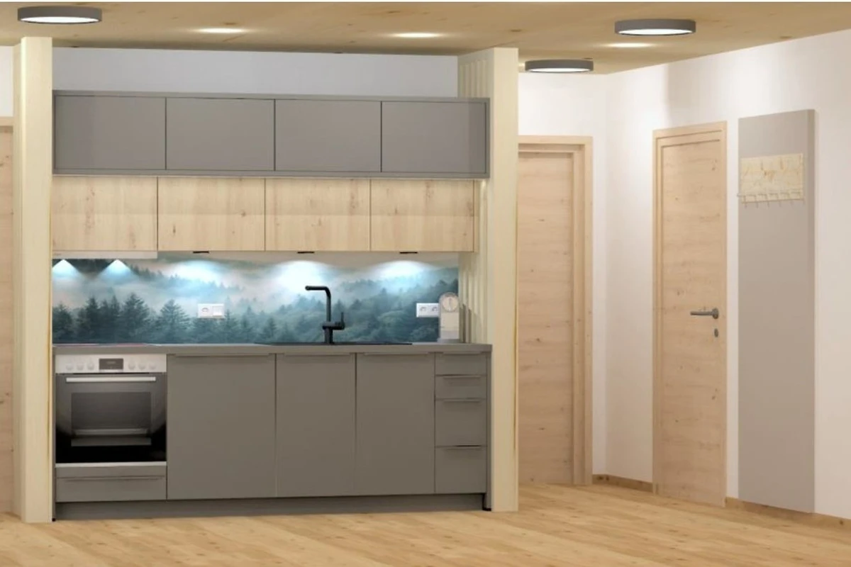 - eine Küchenzeile mit Herd (4 Kochfeldern), Kühlschrank mit Gefrierfach, Kapsel- Kaffeemaschine, Toaster, Wasserkocher, Geschirrspüler, Geschirr und Besteck und Küchengrundutensilien