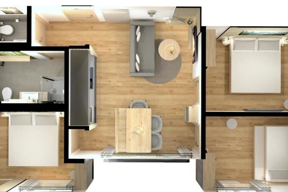 - ein Schlafzimmer mit einem Ausziehbett (zwei Einzelbetten 90x200cm) und TV