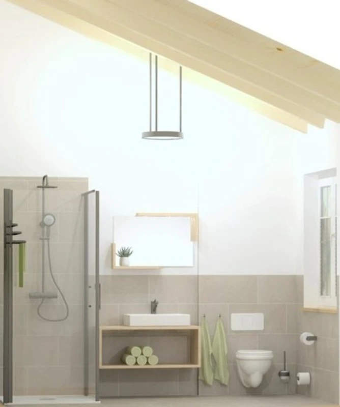 - ein Badezimmer mit WC, bodengleiche Dusche und Föhn