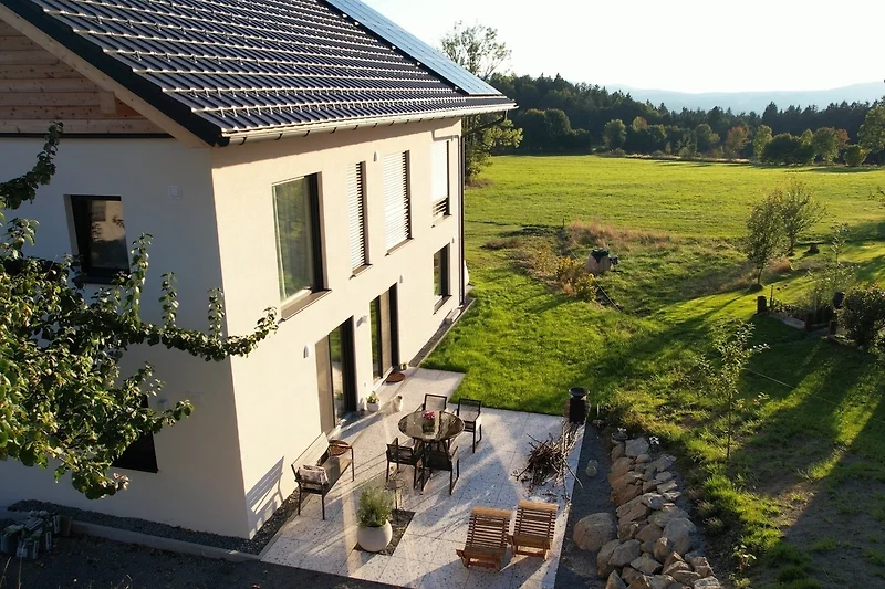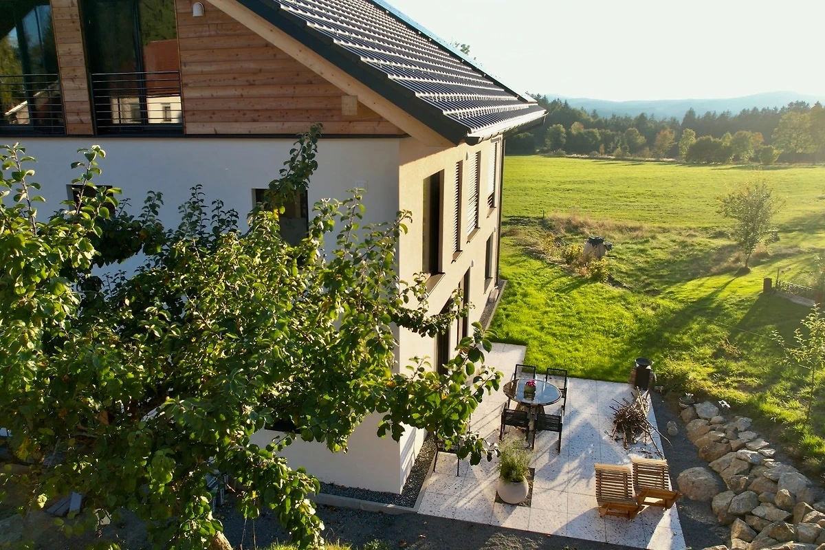 Wie schön, dass du zu uns gefunden hast! Auf dieser Seite möchten wir dir unser Appartement vorstellen, ein liebevoll eingerichteter Rückzugsort im Herzen des Bayerischen Waldes. Unsere Villa Barka ist ein Ort zum Wohlfühlen: stilvoll gestaltet, ruhig gelegen und umgeben von unberührter Natur. Wir vermieten unser Zuhause an Gäste, die Wert auf Achtsamkeit, Ruhe und eine geschmackvolle Atmosphäre legen. Entdecke, was dich hier erwartet und lass dich inspirieren zu deiner nächsten Auszeit inmitten einer einzigartigen Landschaft. Unser ökologisch und klimapositiv konzipiertes Haus wurde 2024 in moderner Holzständerbauweise fertiggestellt und überzeugt mit einem natürlichen, gesunden Wohnklima. Die hocheffiziente Dämmung und der nachwachsende Rohstoff Holz sorgen für besonders niedrigen Energieverbrauch und eine ausgezeichnete Umweltbilanz. Solarstrom aus unserer eigenen Photovoltaikanlage wird vor Ort gespeichert und versorgt das gesamte Haus zuverlässig mit sauberer Energie und sollte das einmal nicht ausreichen, beziehen wir garantiert zu 100% regenerativ erzeugten Strom. Und natürlich können Gäste ihr Elektroauto direkt bei uns komfortabel laden. Damit vereint unser Zuhause nachhaltiges Wohnen und echte Zukunftsfähigkeit für Mensch und Natur. Geniessen Sie nach einem tollen Tag die wunderbare Regendusche, lassen Sie sich von den Flammen des elektrischen Kamins verzaubern oder lassen Sie den Tag auf der 35 qm grossen Terrrasse ausklingen.