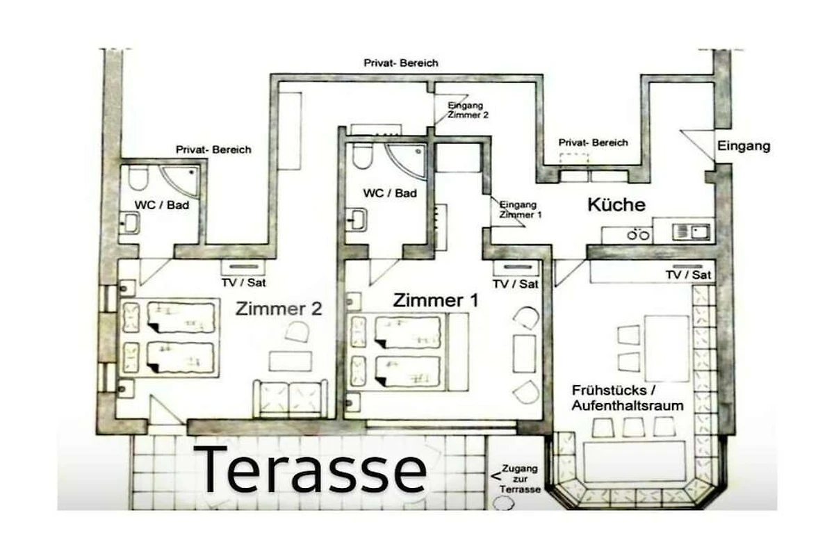 Unsere Ferienwohnung besitzt 2 Zimmer mit Sitzecke, einem kleinen Flur mit Wäscheschrank und je eine Dusche /WC. Terasse