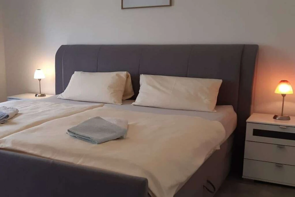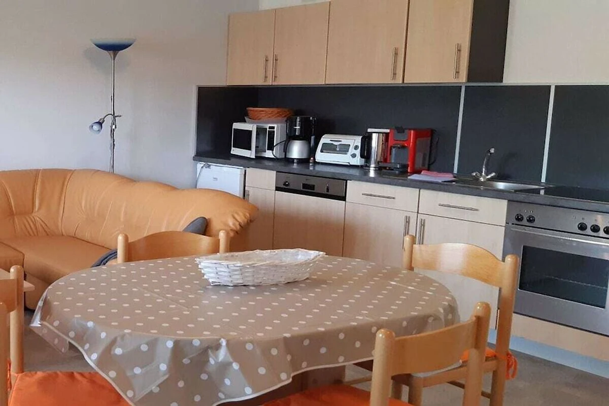 Die komfortabel eingerichtete Ferienwohnung verfügt über 2 Schlafzimmer mit 1 Boxspringbett bzw. 2 Einzelbetten, ein Duschbad sowie eine geräumige Wohnküche mit Cerankochfeld, Geschirrspüler, Kühlschrank, Minibackofen,Wasserkocher und allem erforderlichen Geschirr.