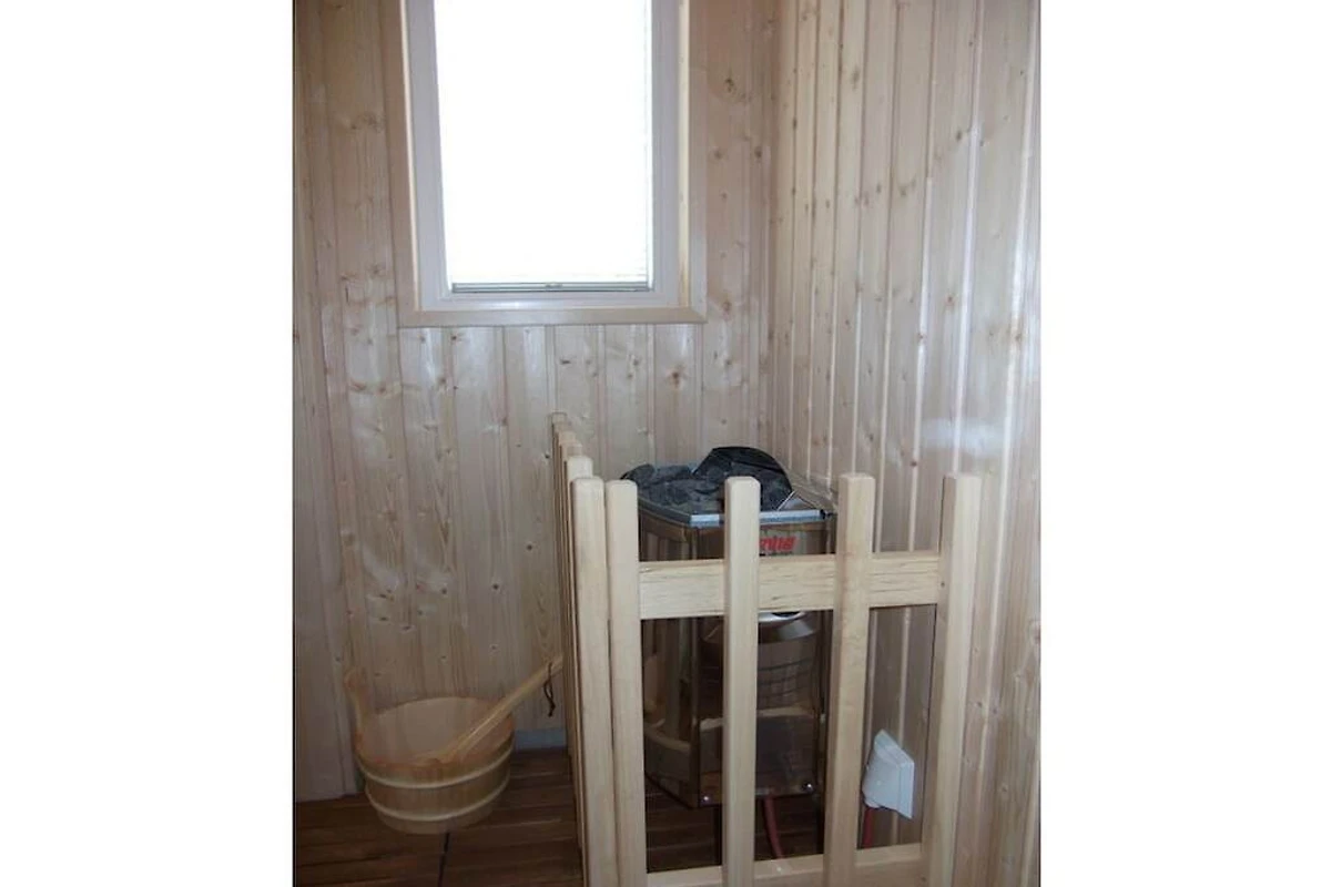 Parterre: (Schlafzimmer(, Doppelbett, Babybett, Heizung), Schlafzimmer(, Einzelbett, Einzelbett, Heizung), Badezimmer(, Toilette, Dusche, Waschbecken, Heizung), Ruheraum(Sauna), Abstellraum(, Hochstuhl, Bügelbrett, Bügeleisen, Trockenschrank))